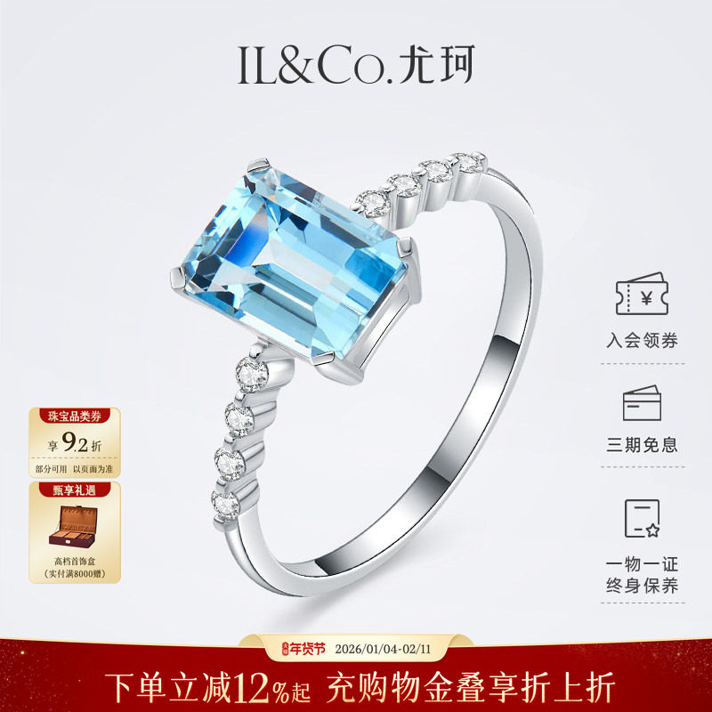 ILCO尤珂「冰蓝方糖」18K金天然海蓝宝石戒指时尚方形彩宝女款戒