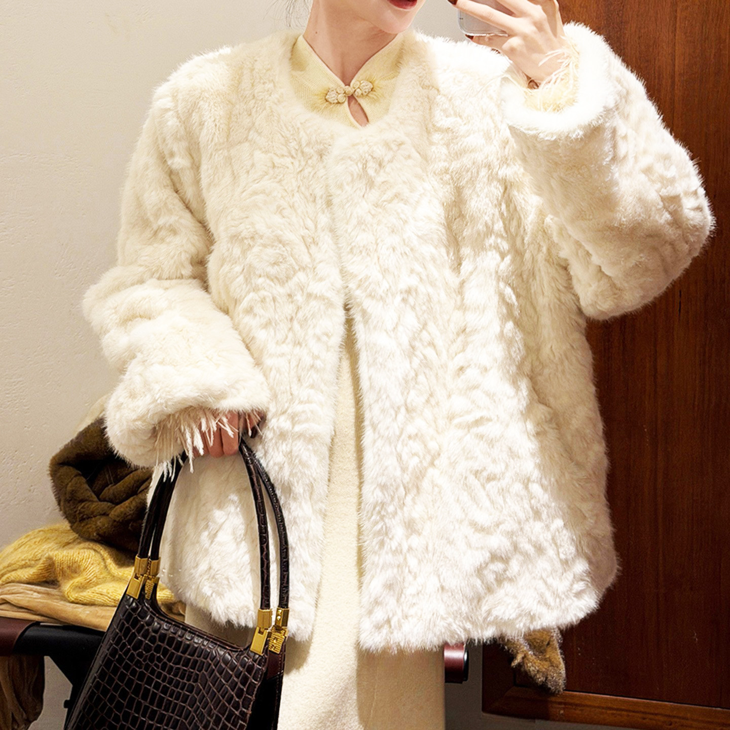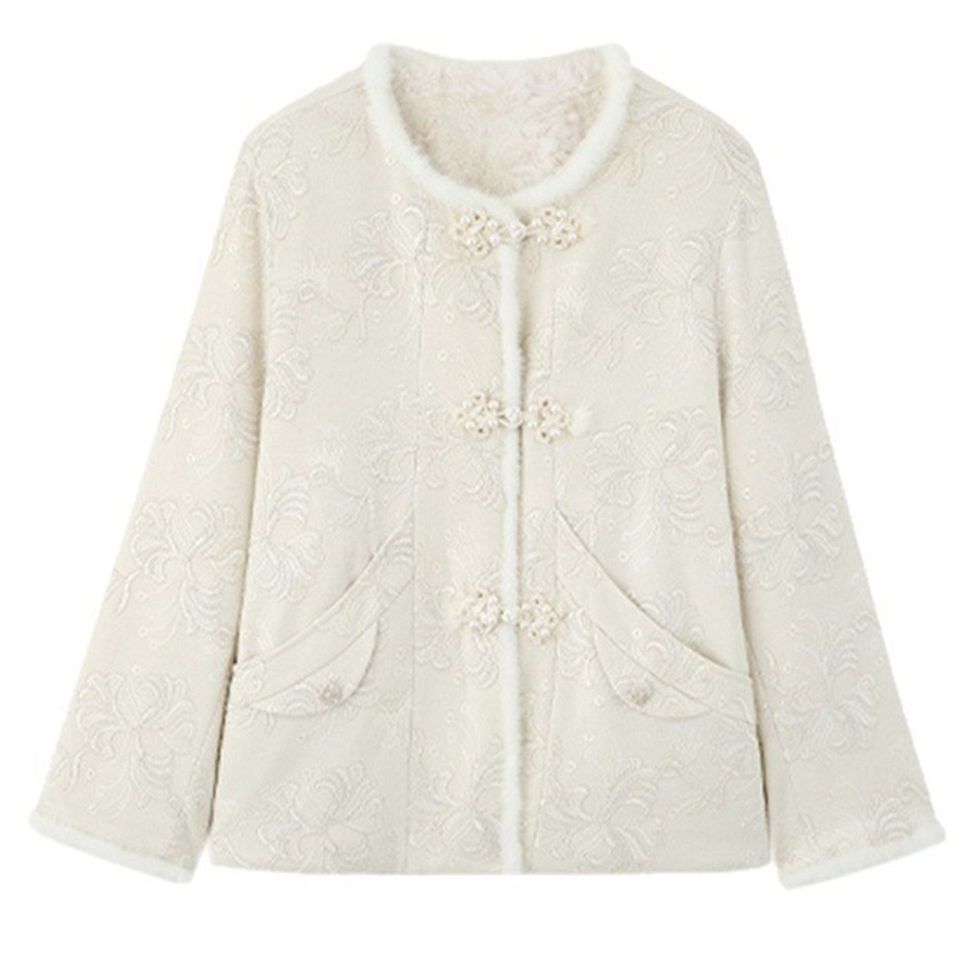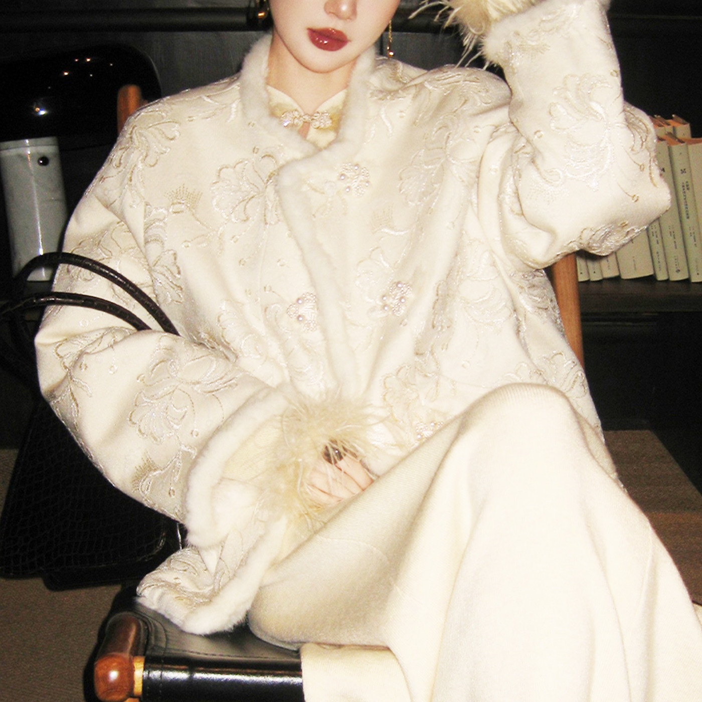 新中式国风羽绒服宋锦盘扣加绒厚开衫外套提花小香棉服棉袄狐貂毛