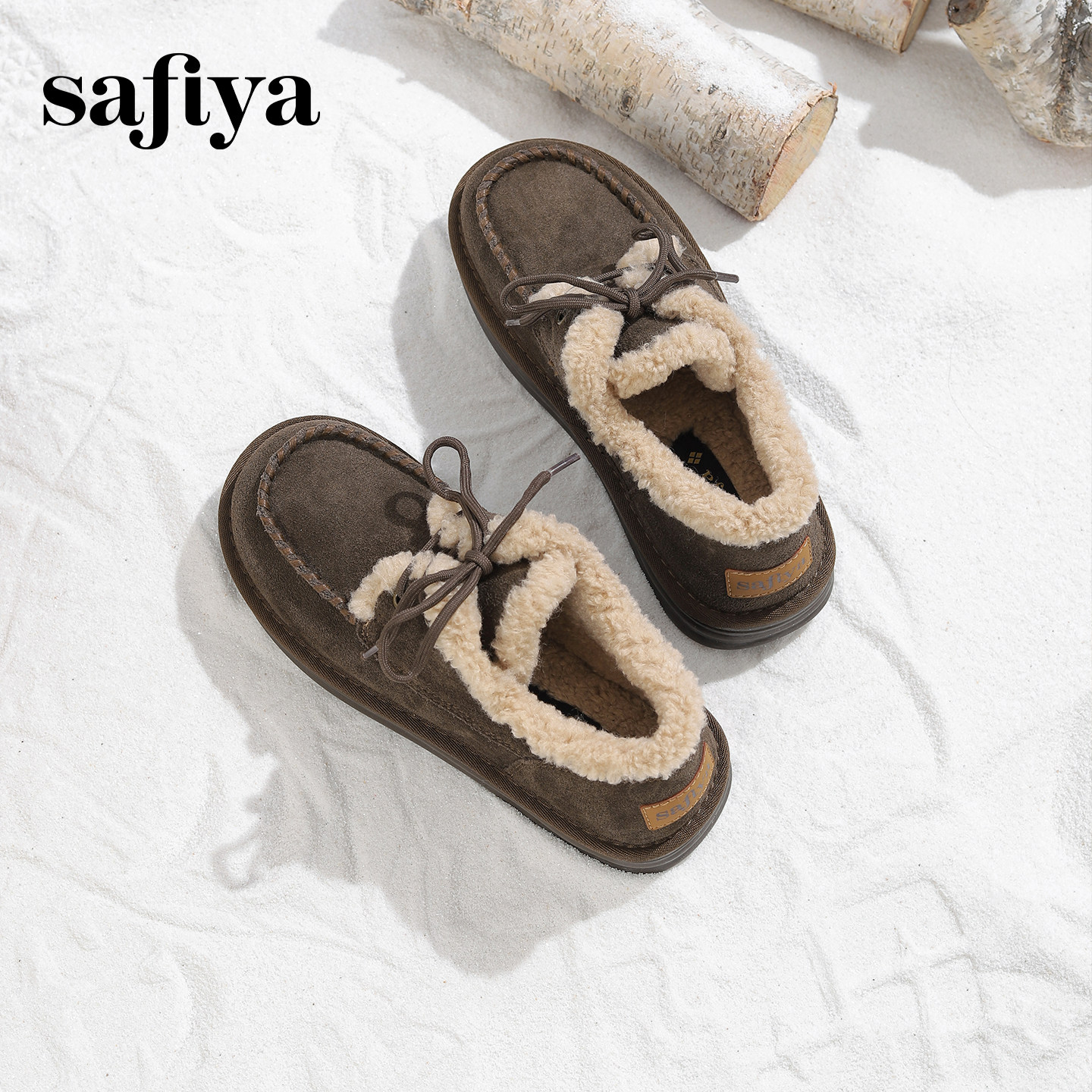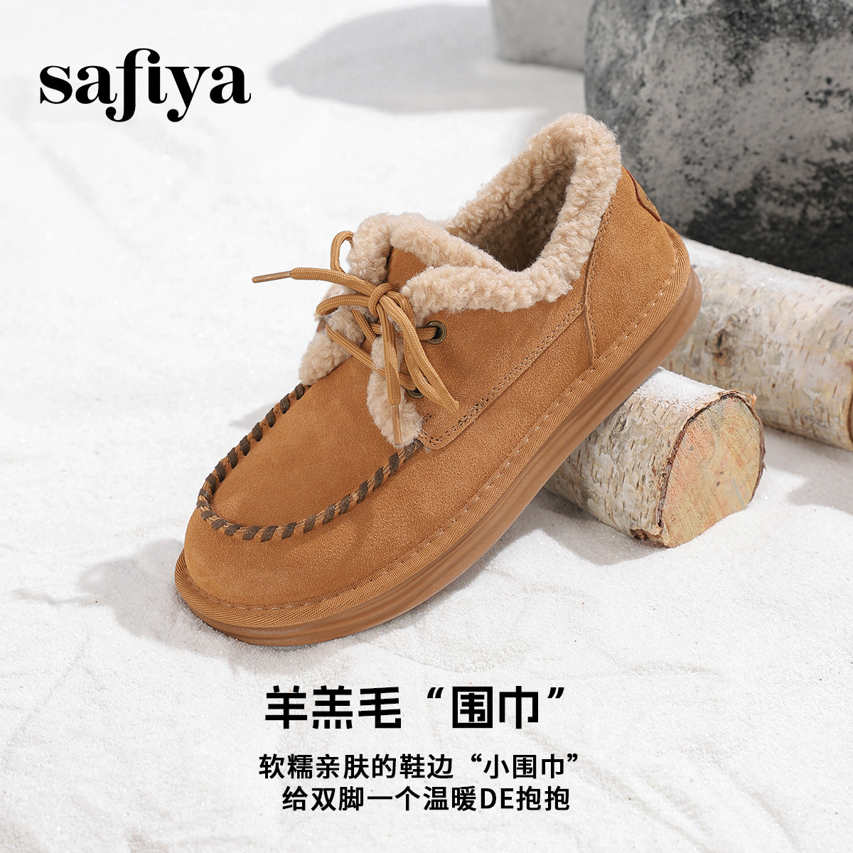 Safiya/索菲娅2025冬季新品加绒系带复古外穿平底毛毛鞋雪地靴女