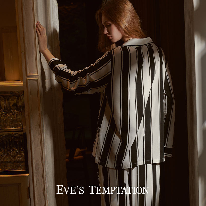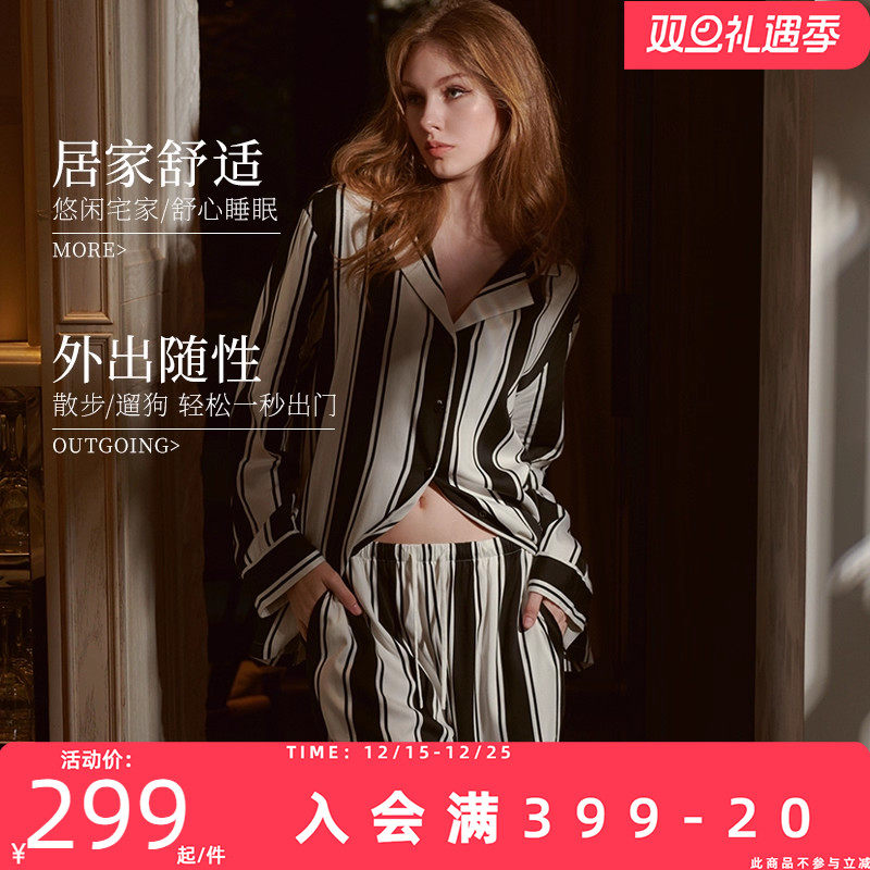 夏娃的诱惑幽若睡衣女春秋开衫翻领时尚条纹长袖宽松家居服套装
