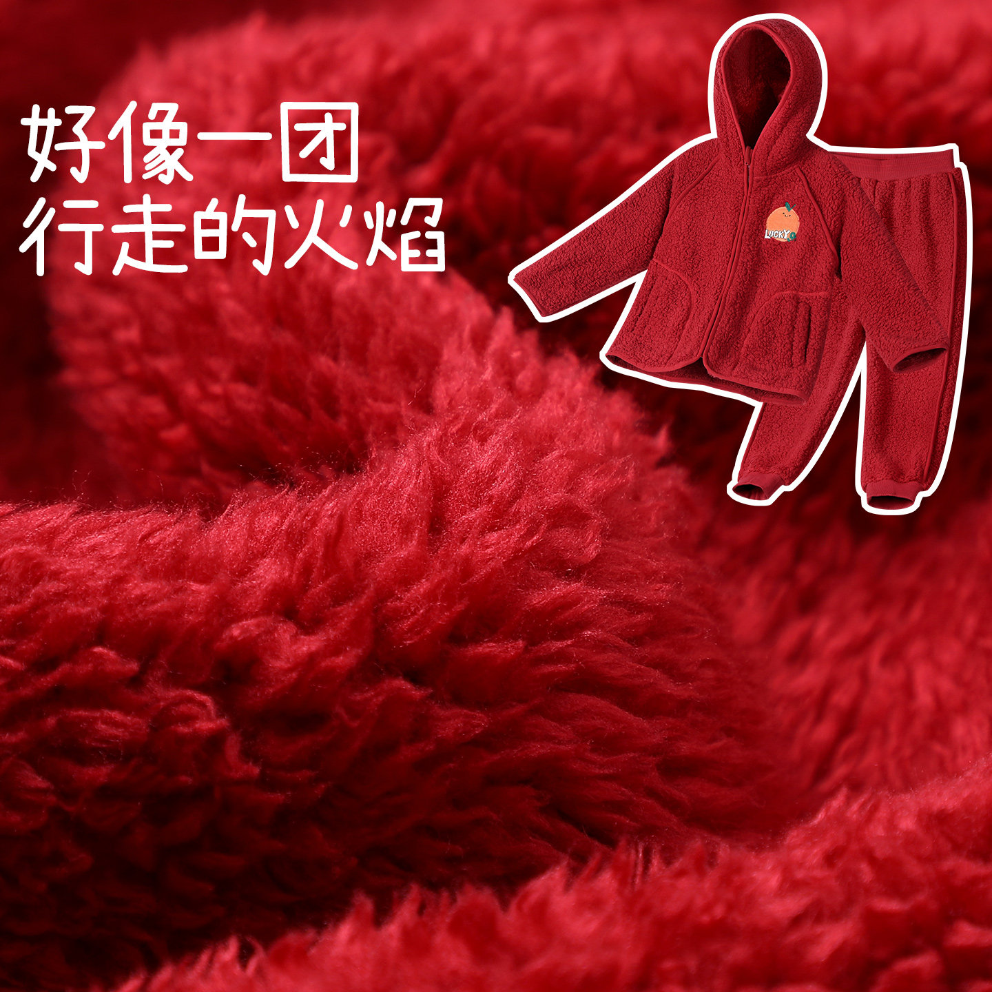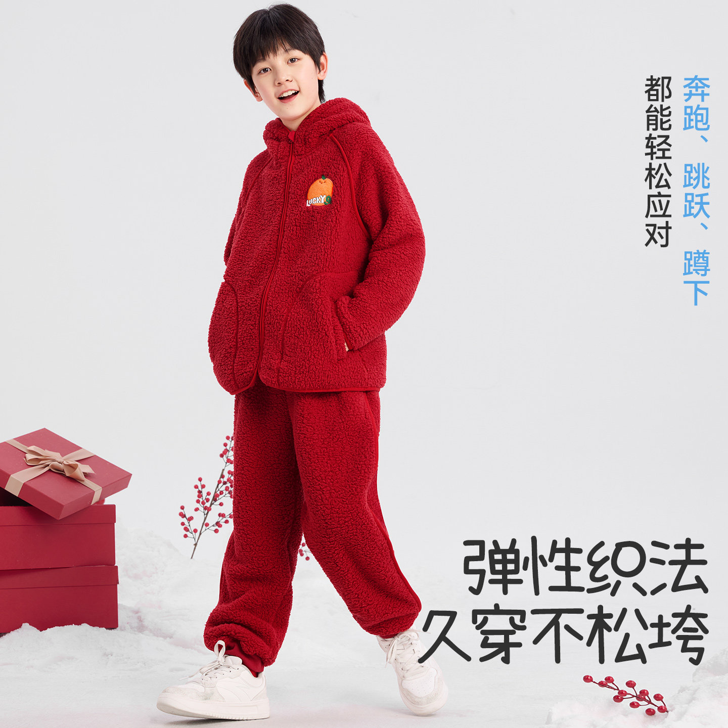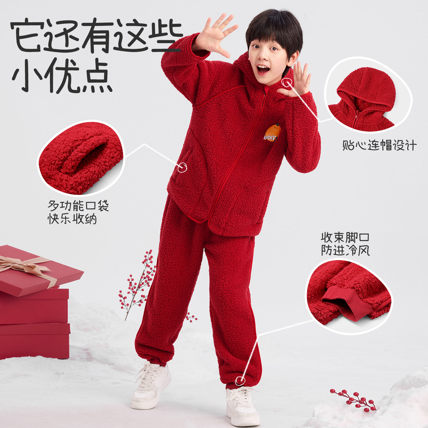 久岁伴儿童睡衣男女童秋冬新品大红色连帽衣中大童宝宝家居服套装