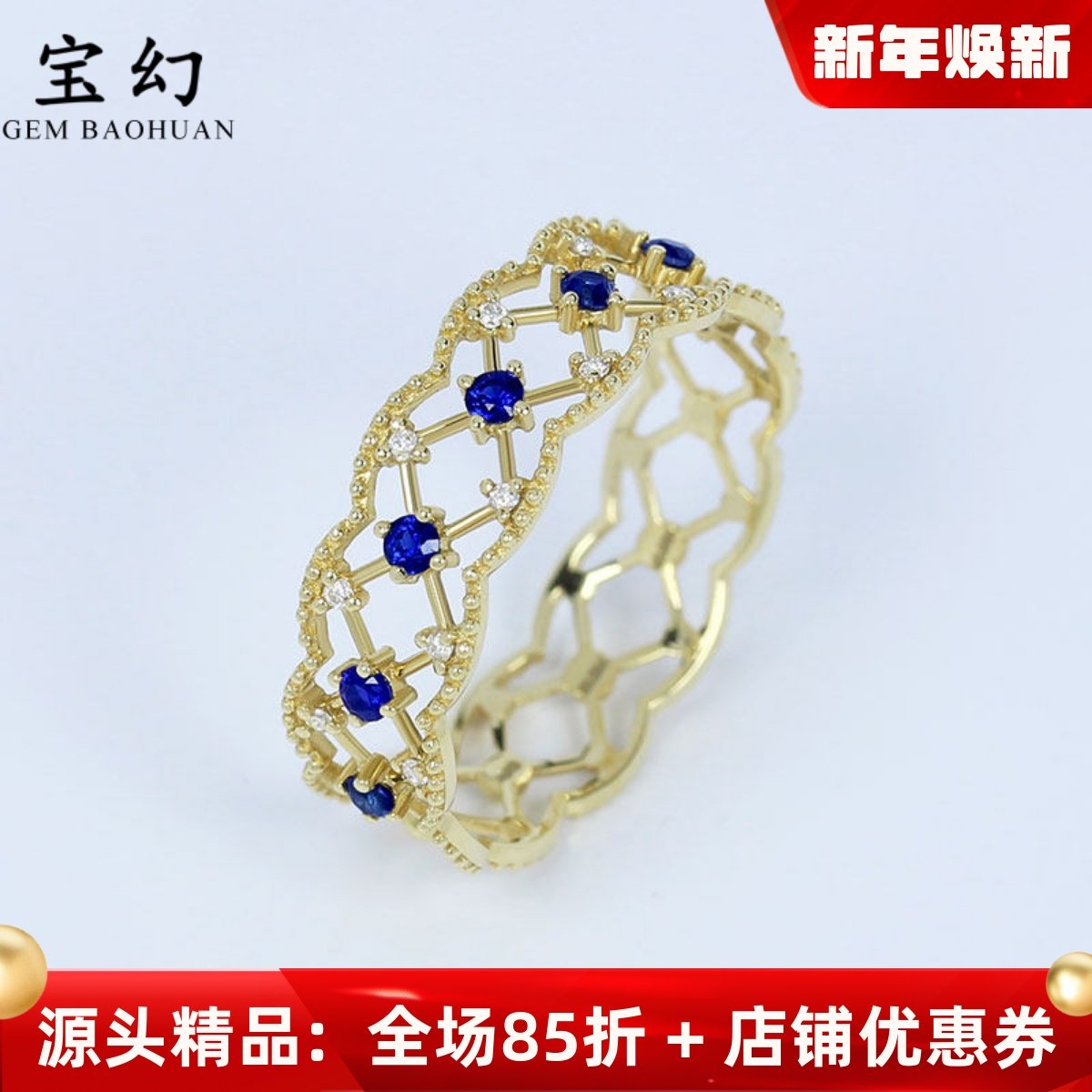 加厚18k黄金天然蓝宝石钻石戒指 精美彩宝复古镂空蕾丝珠边女指环