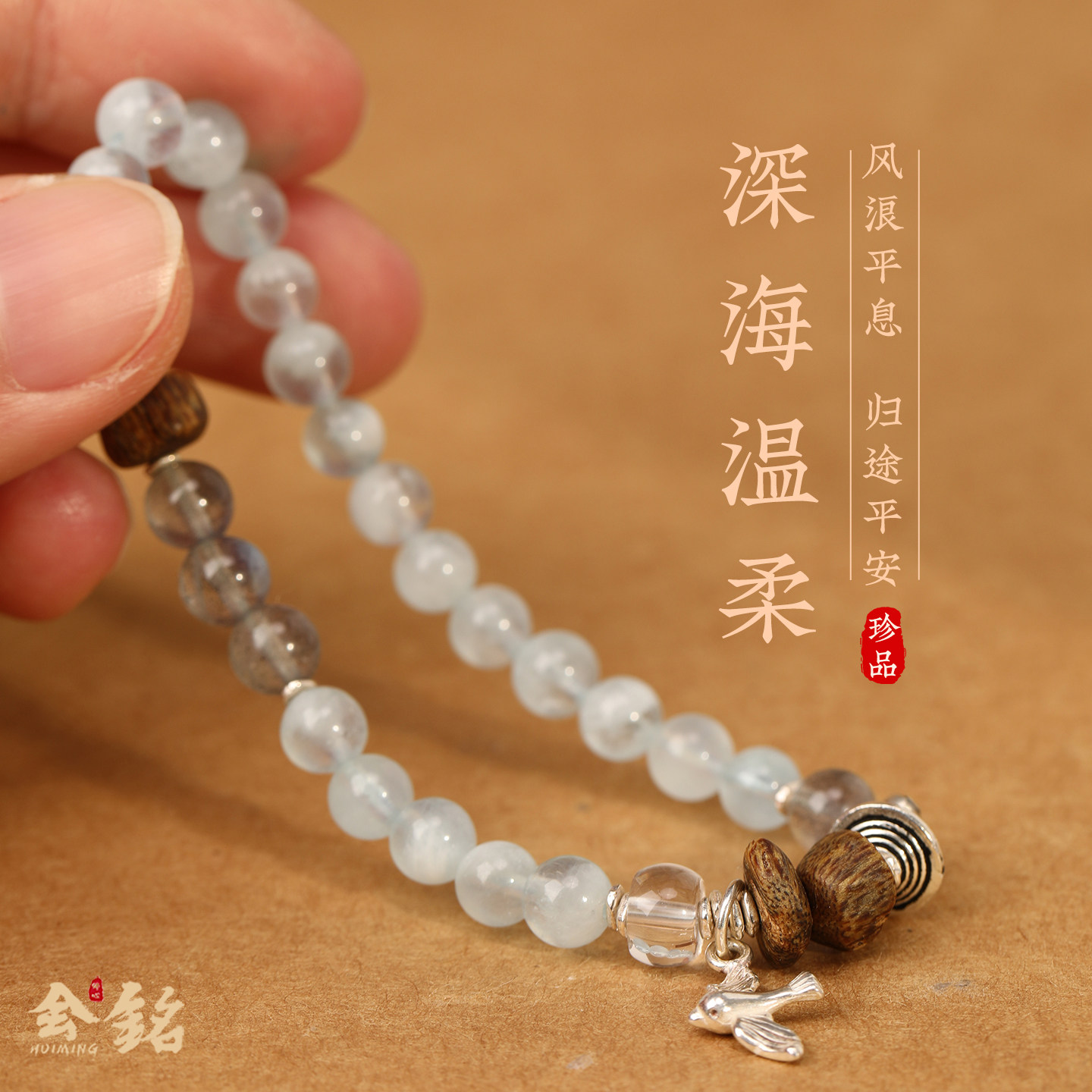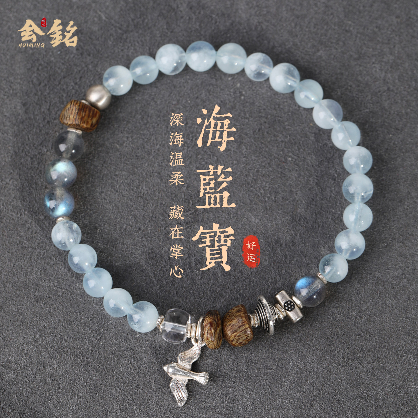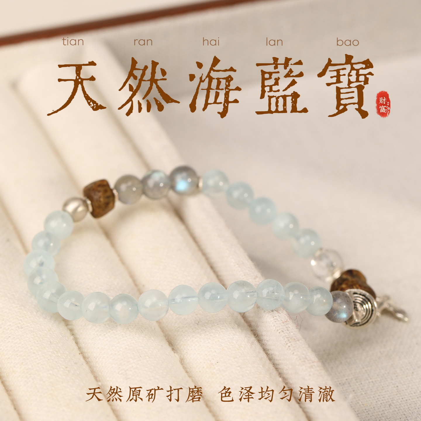 新款设计感天然海蓝宝手串女补水单圈随行沉香珠925纯银小碎银子