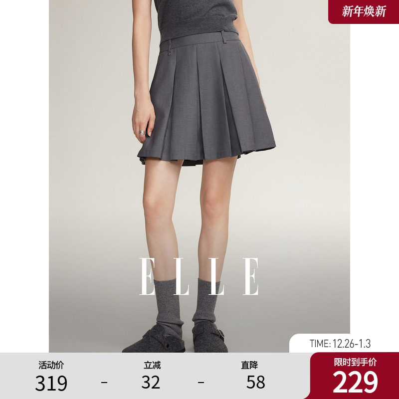 【学院百褶裙】ELLE灰色高腰显瘦半身裙女2025秋季新款小个子短裙
