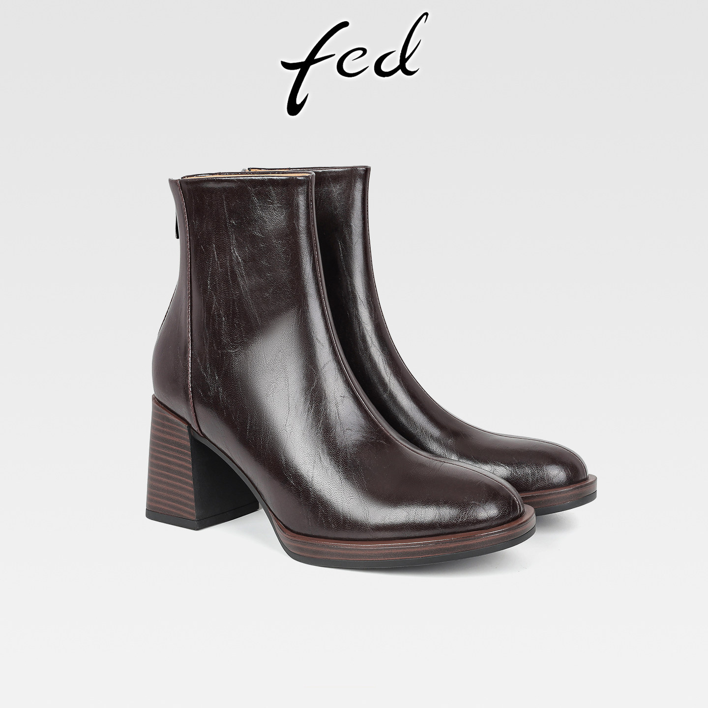 fed复古真皮粗跟厚底瘦瘦靴女秋冬新款后拉链气质圆头高跟小短靴