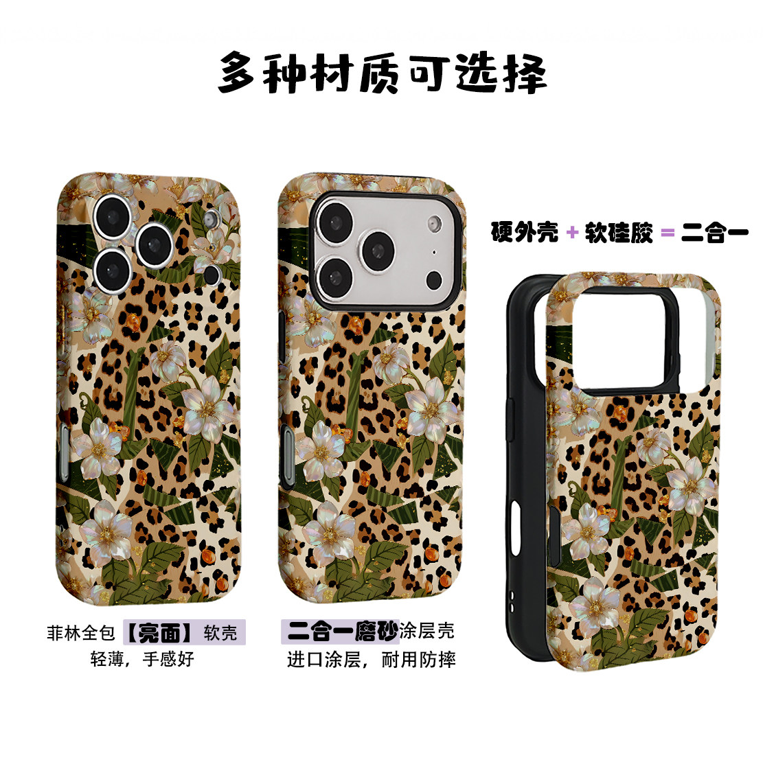 个性艺术豹纹贝母之花菲林二合一手机壳适用苹果17nova14华为p70mate60小米15opporen14ovivo荣耀300iPhone16
