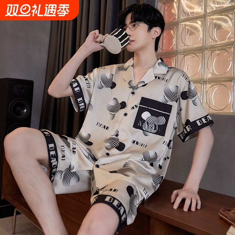 男士睡衣夏季冰丝薄款套装2025年新款男式短袖大码丝绸家居服短裤
