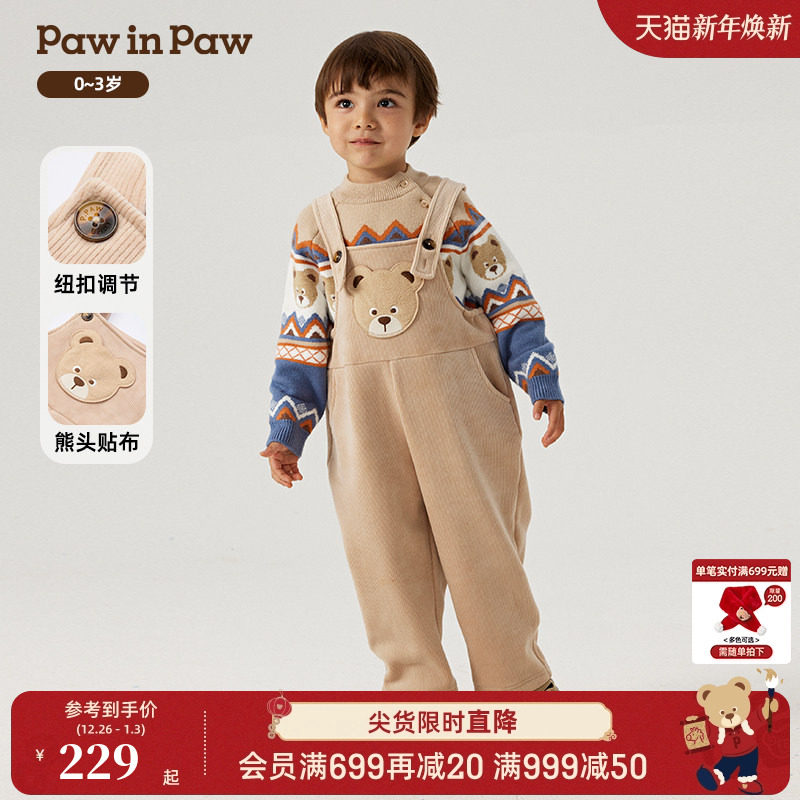 PawinPaw卡通小熊童装秋冬男宝宝可调节肩带加绒背带裤舒适