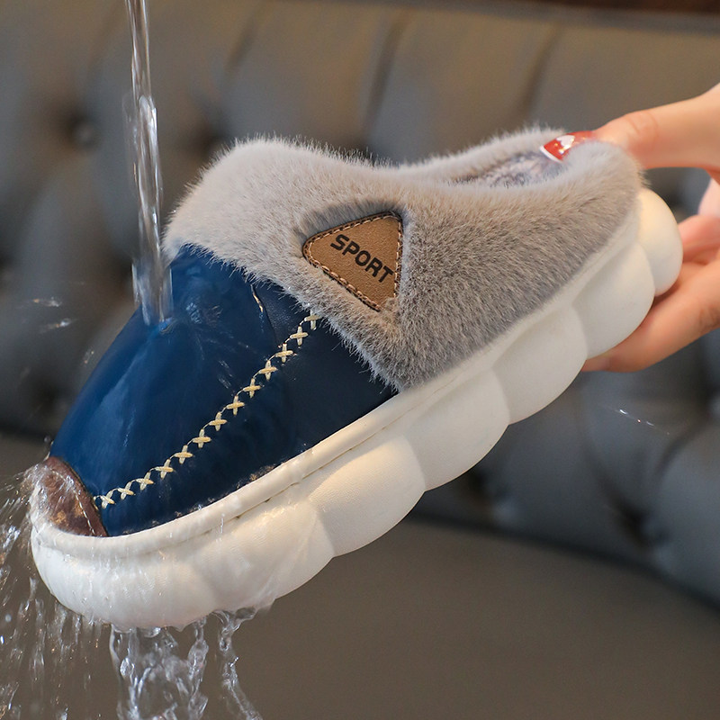 秋冬季儿童拖鞋男童皮面防水加绒加厚女童棉拖鞋软底亲子棉鞋室内
