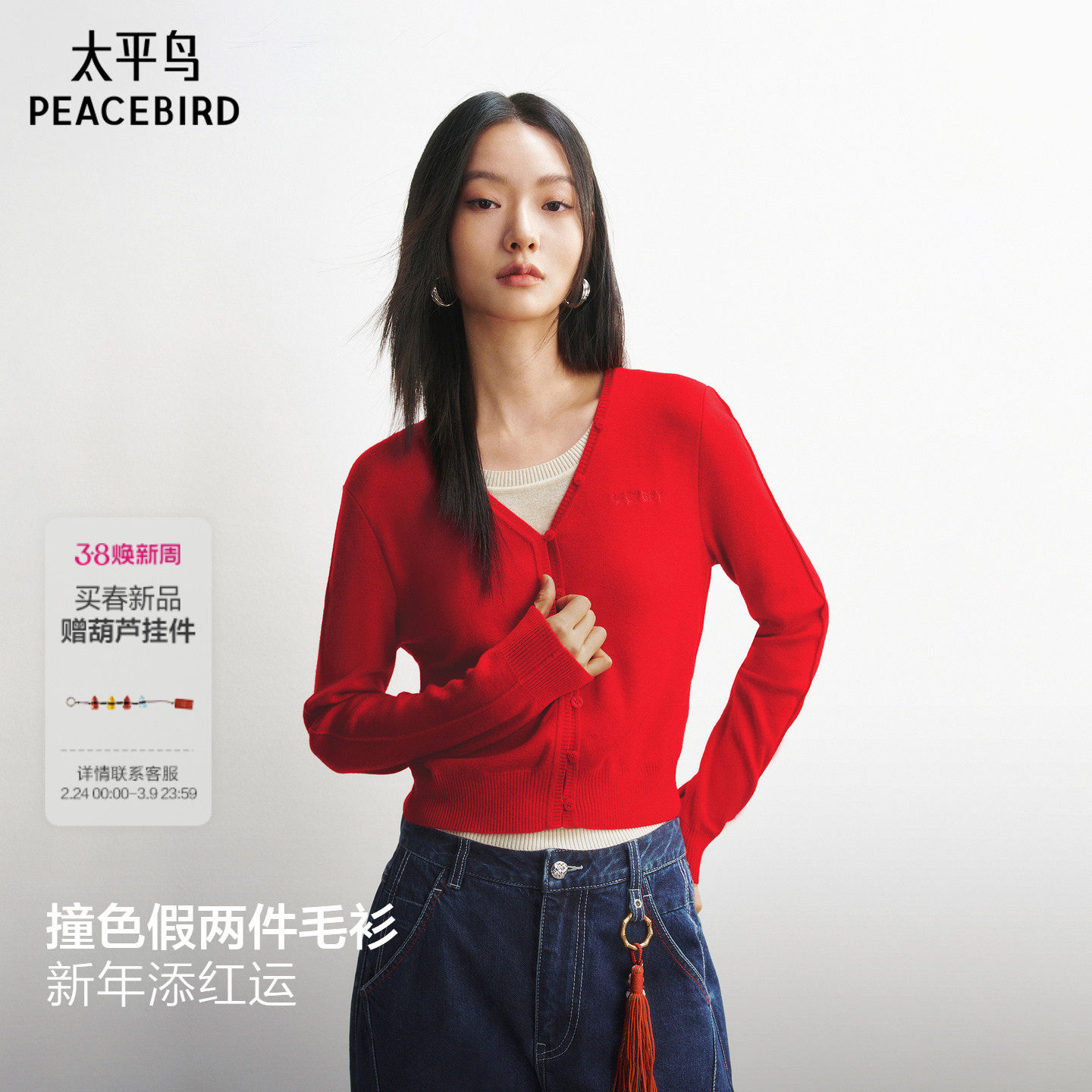 【商场同款】太平鸟羊毛混纺假两件撞色新年红色针织衫A3EEG1211