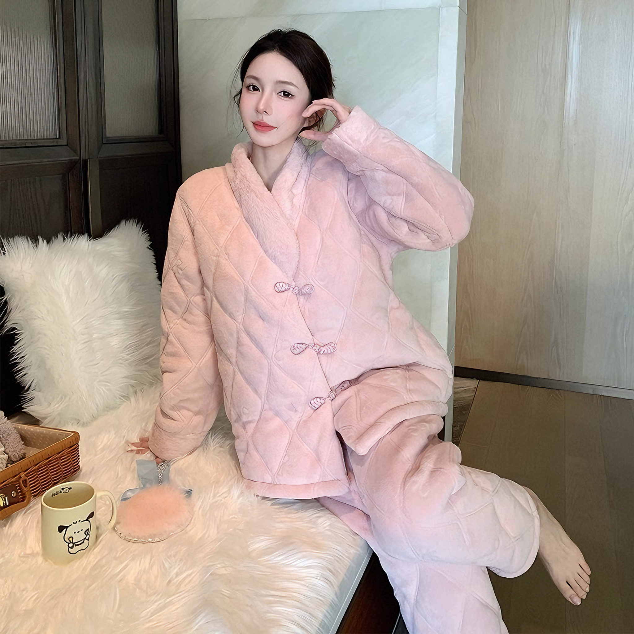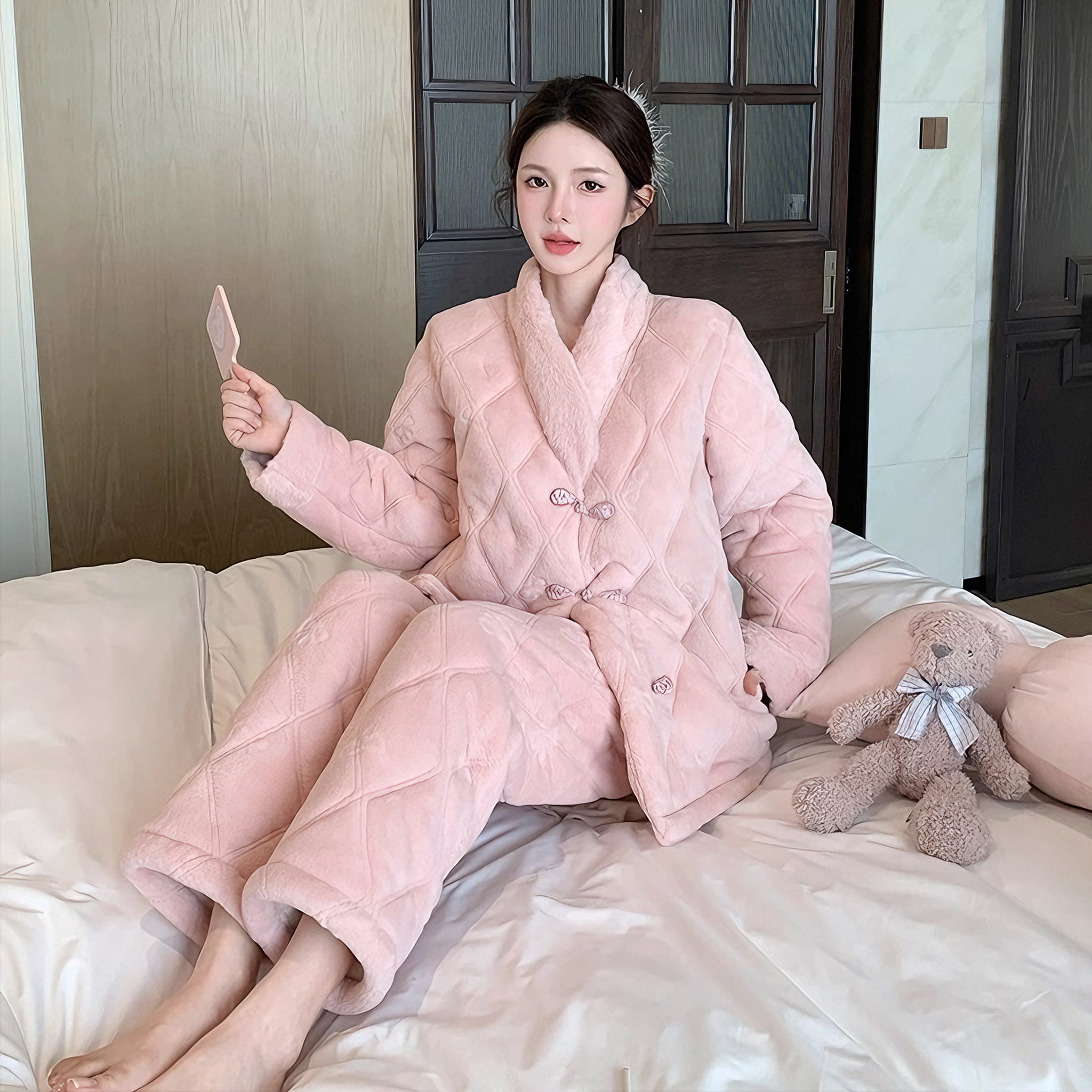 熊拾玖2025新款睡衣女冬季三层夹棉加绒加厚国风珊瑚绒外穿家居服
