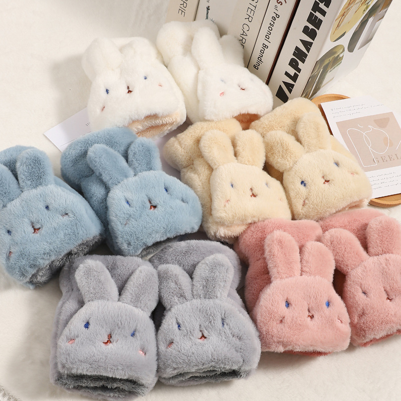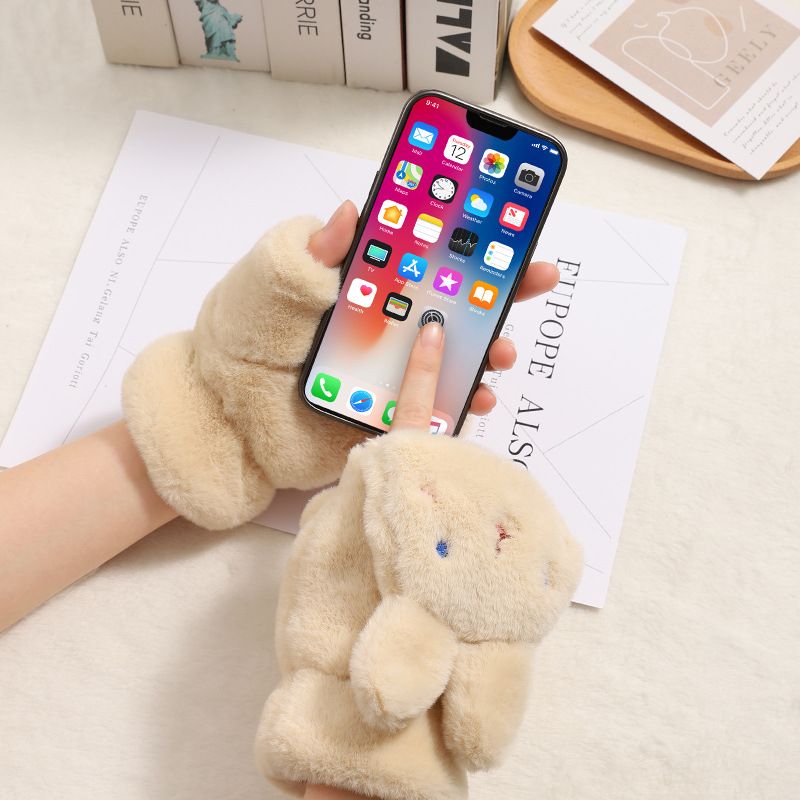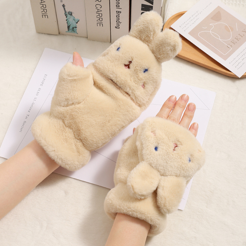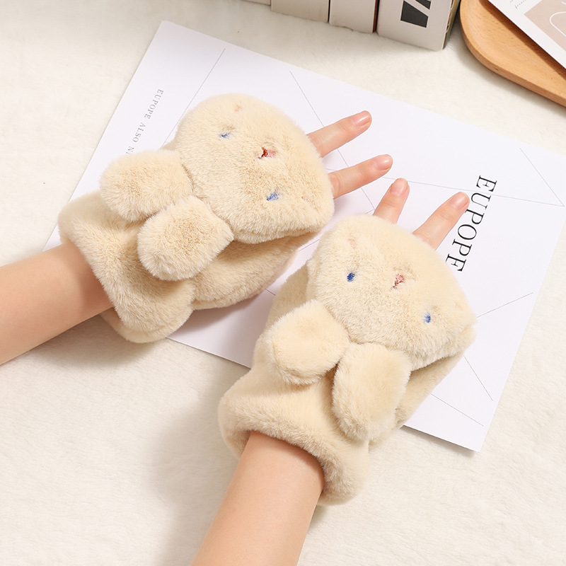 手套女冬天韩版加绒保暖可爱翻盖加厚骑车防寒防风露指女半指白色