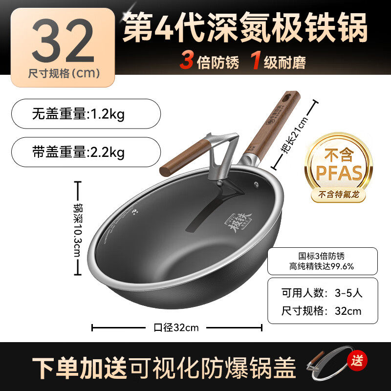 中康铁锅炒锅不粘锅第四代深氮平底锅无涂层电磁炉通用32cm防锈
