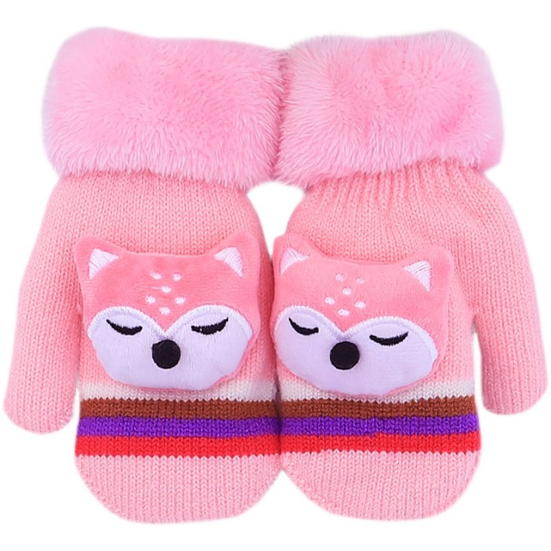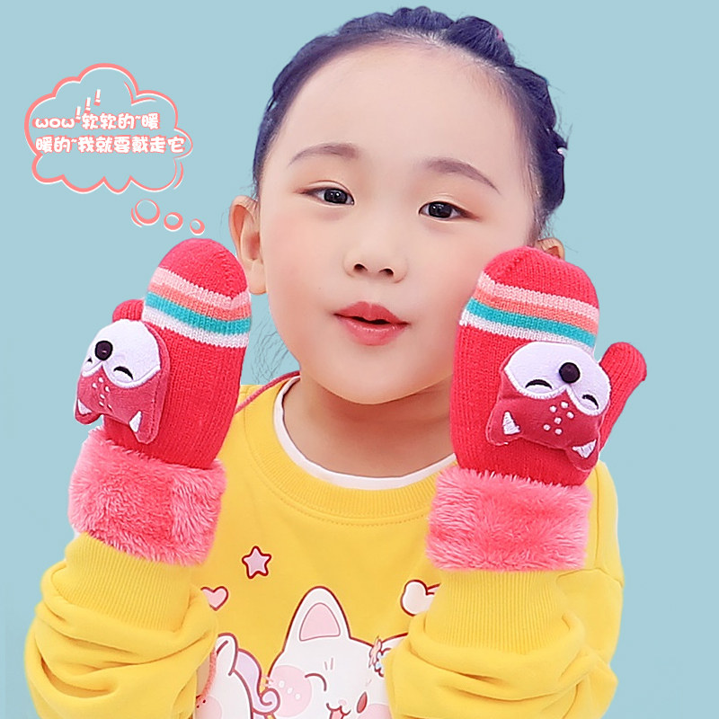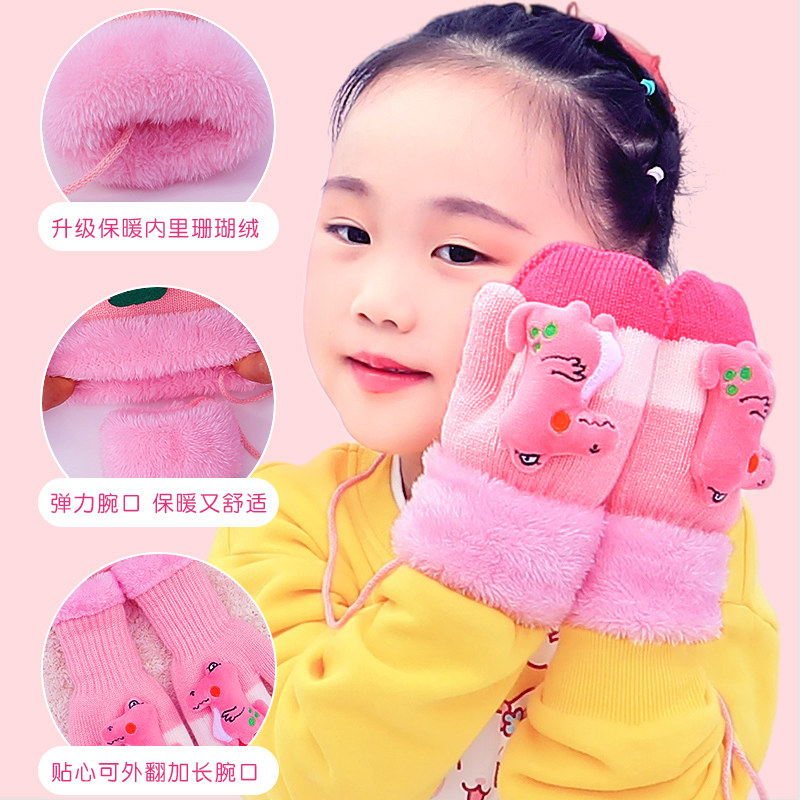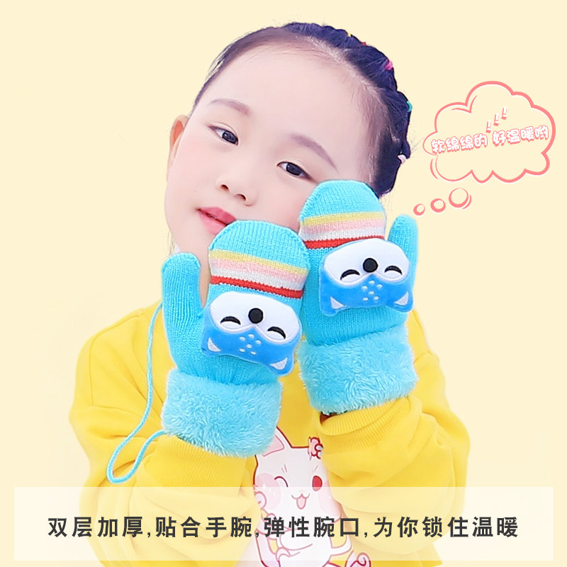 宝宝手套冬加绒加厚保暖男女童儿童小孩可爱卡通挂脖毛线连指卡通