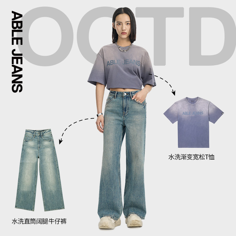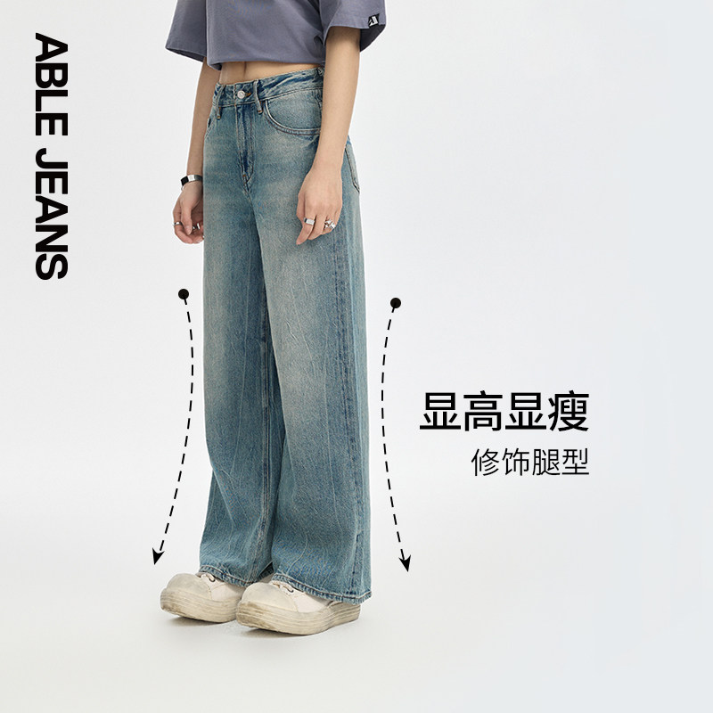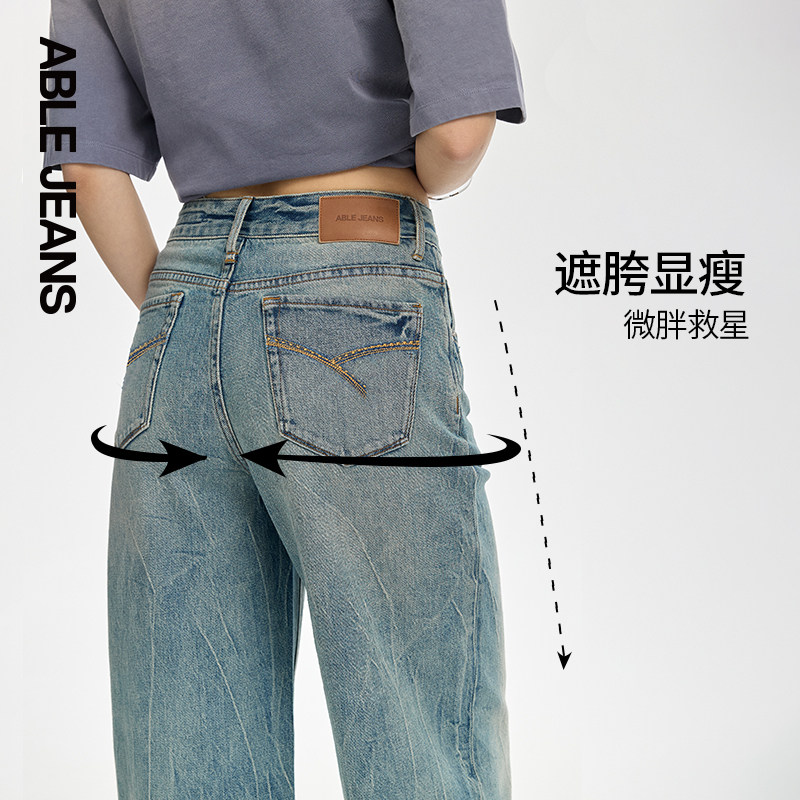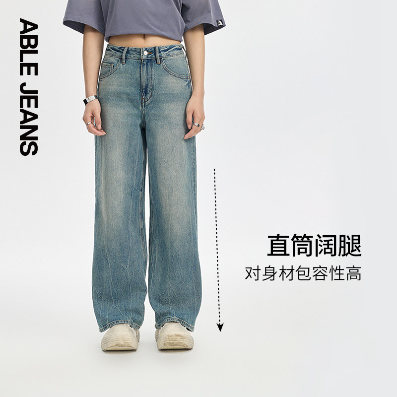ABLE JEANS【直筒阔腿裤】女士春秋款水洗闪电纹宽松直筒牛仔裤