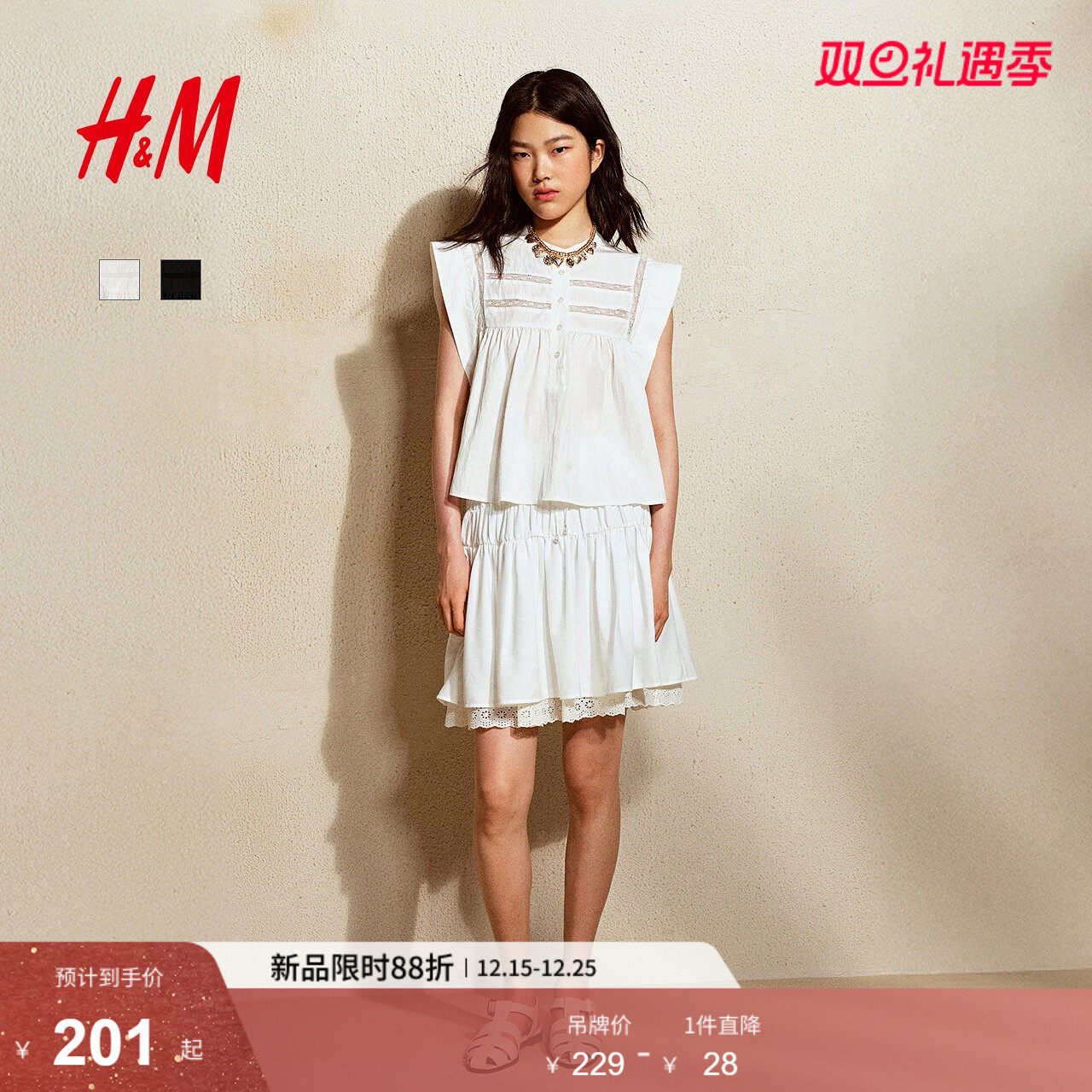 HM女装衬衫2025冬季新款宽松法式蕾丝嵌花短袖衬衣上衣1299433