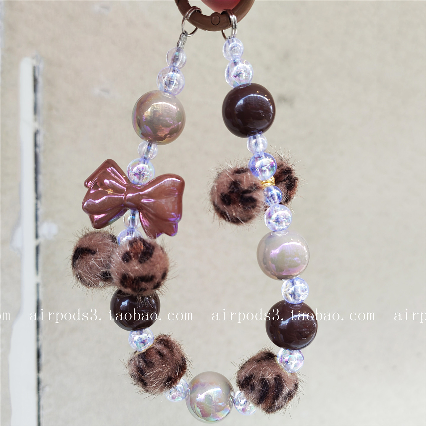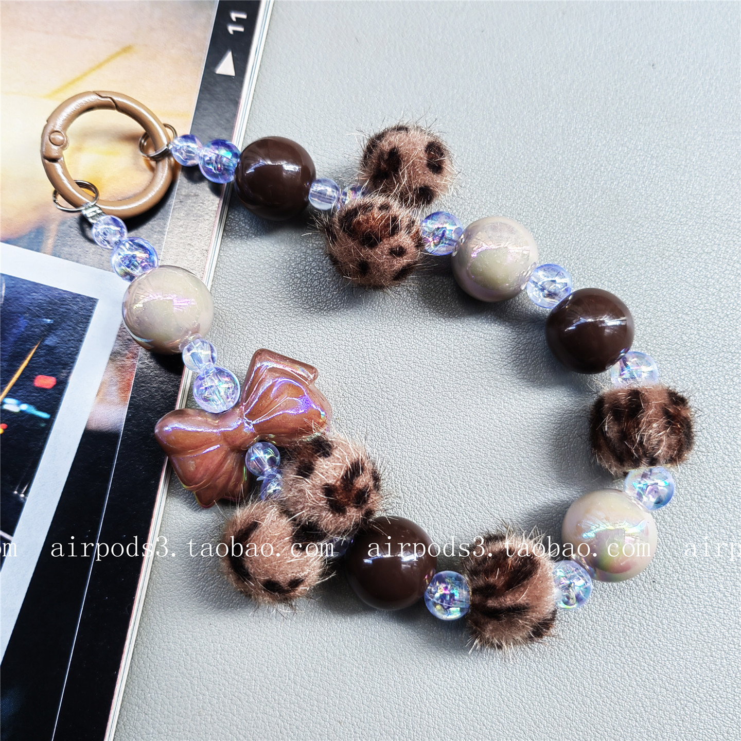ins小香风蝴蝶结豹纹毛球短款手机挂绳手腕链ccd相机串珠包包挂饰