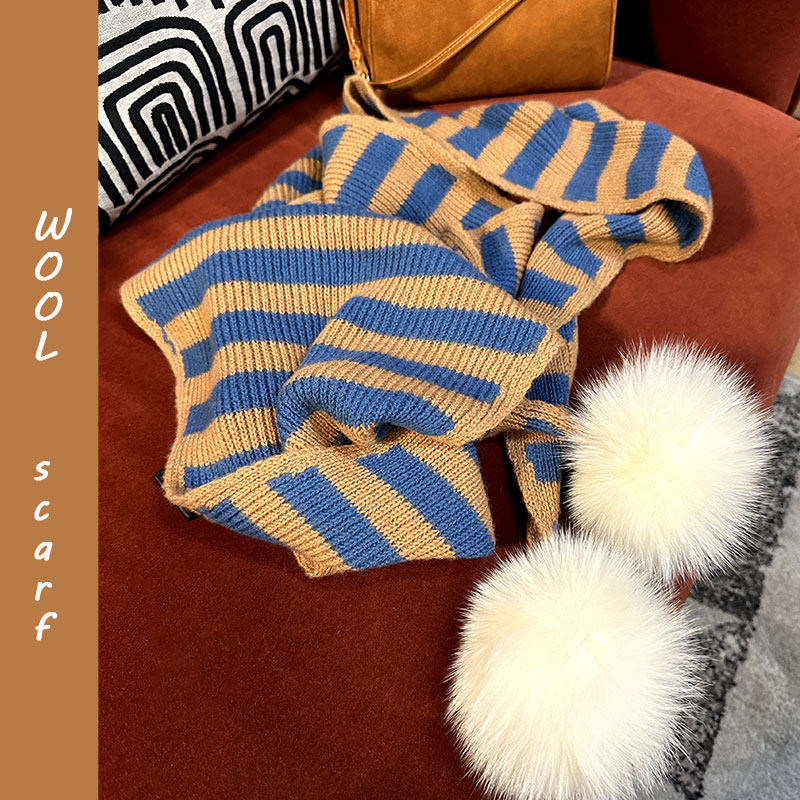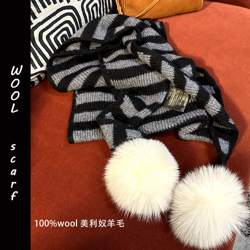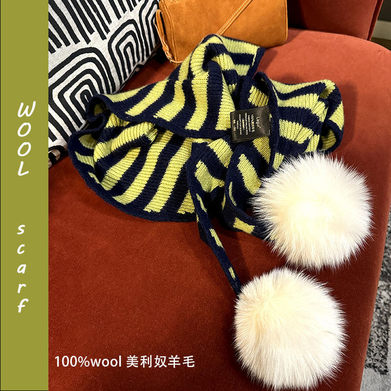 韩单限量款!高支100美利奴羊毛加厚条纹三角围巾保暖大狐狸毛球