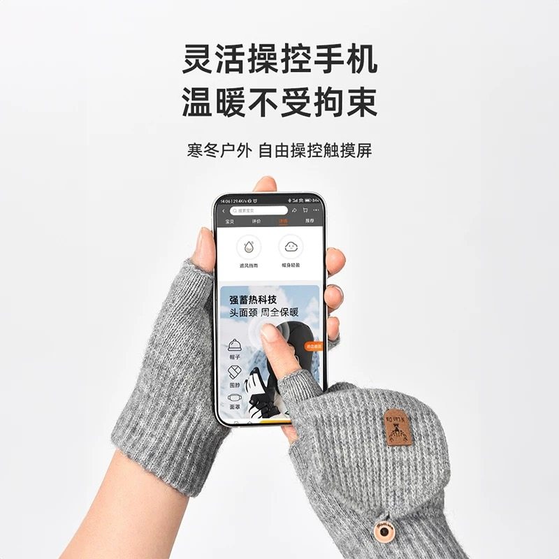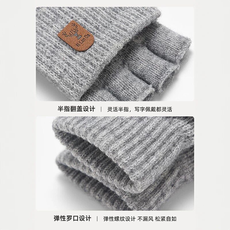 毛线针织手套男秋冬季学生写字骑行触屏保暖半指漏指加绒防寒翻盖