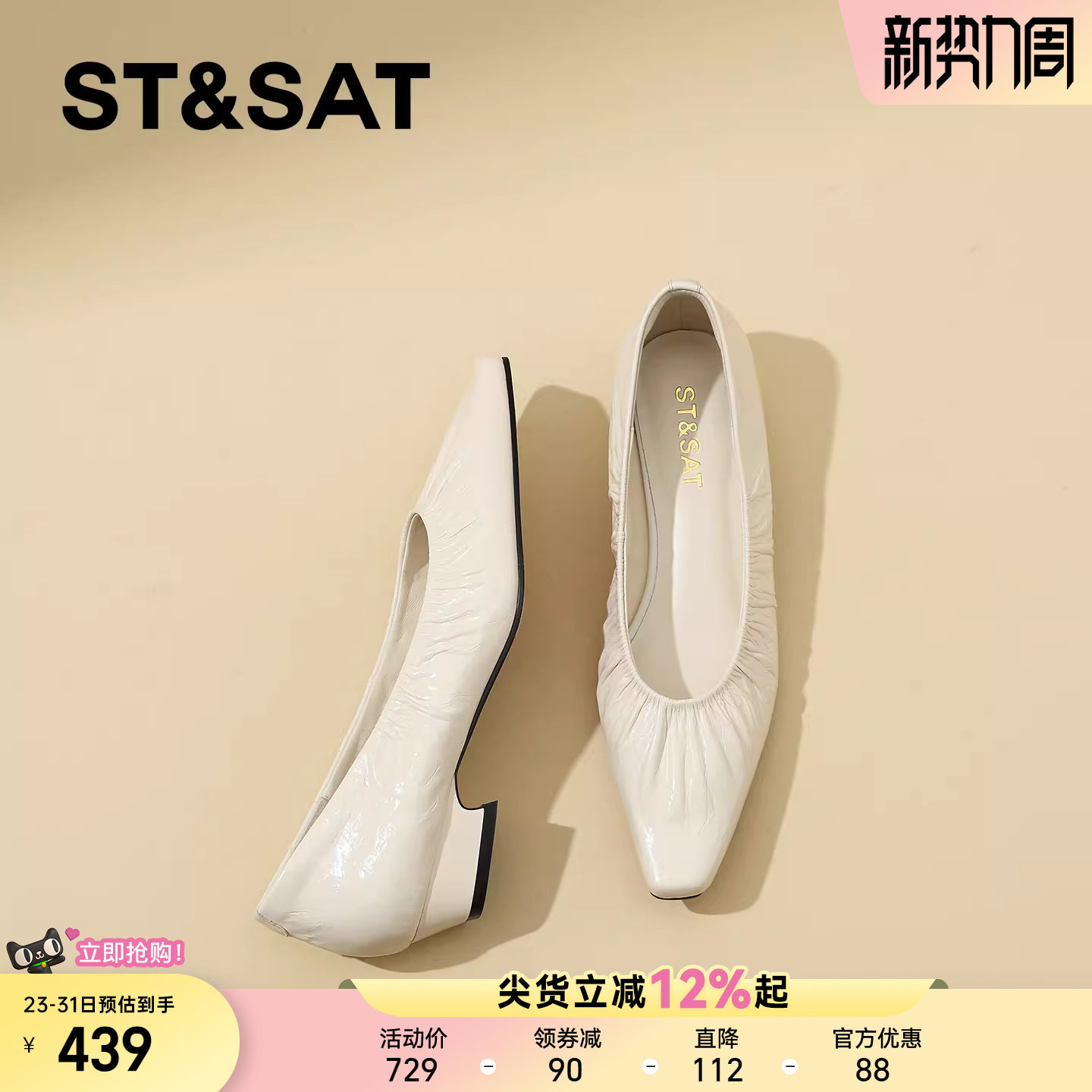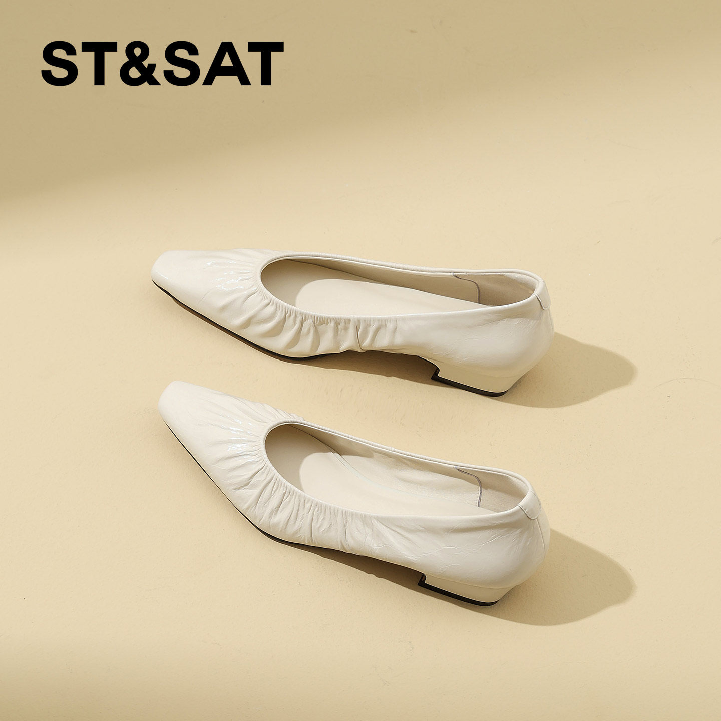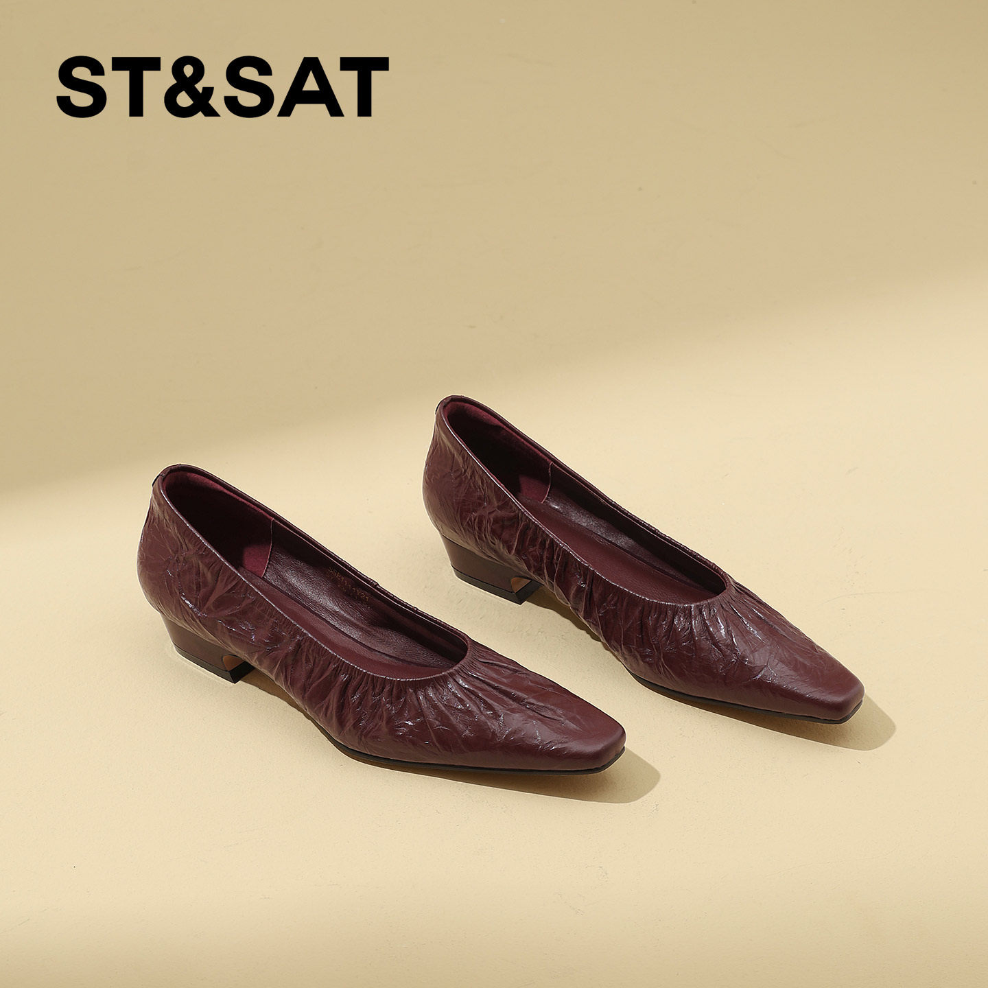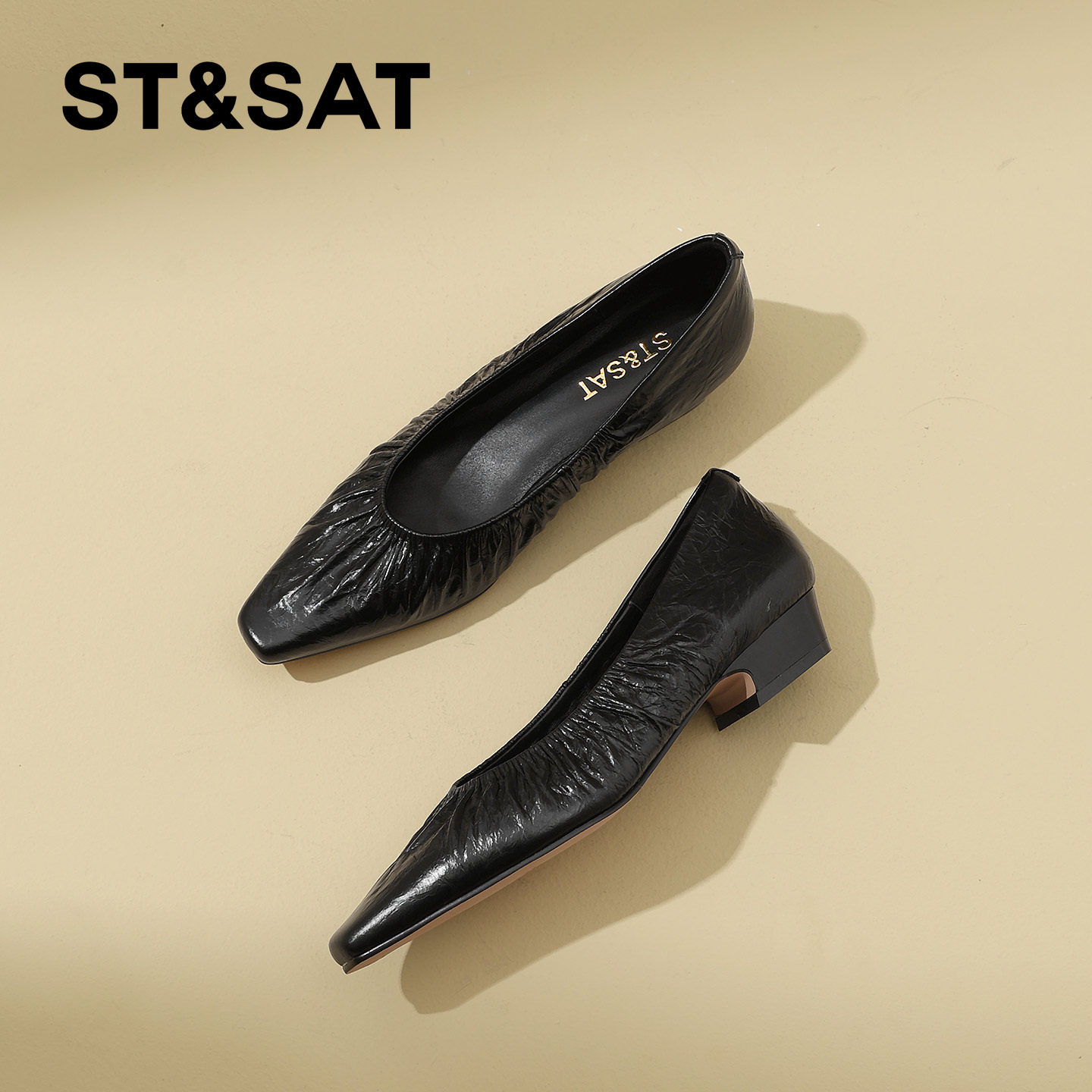 星期六真皮通勤单鞋女2026年春季新款方头粗跟中跟褶皱浅口奶奶鞋