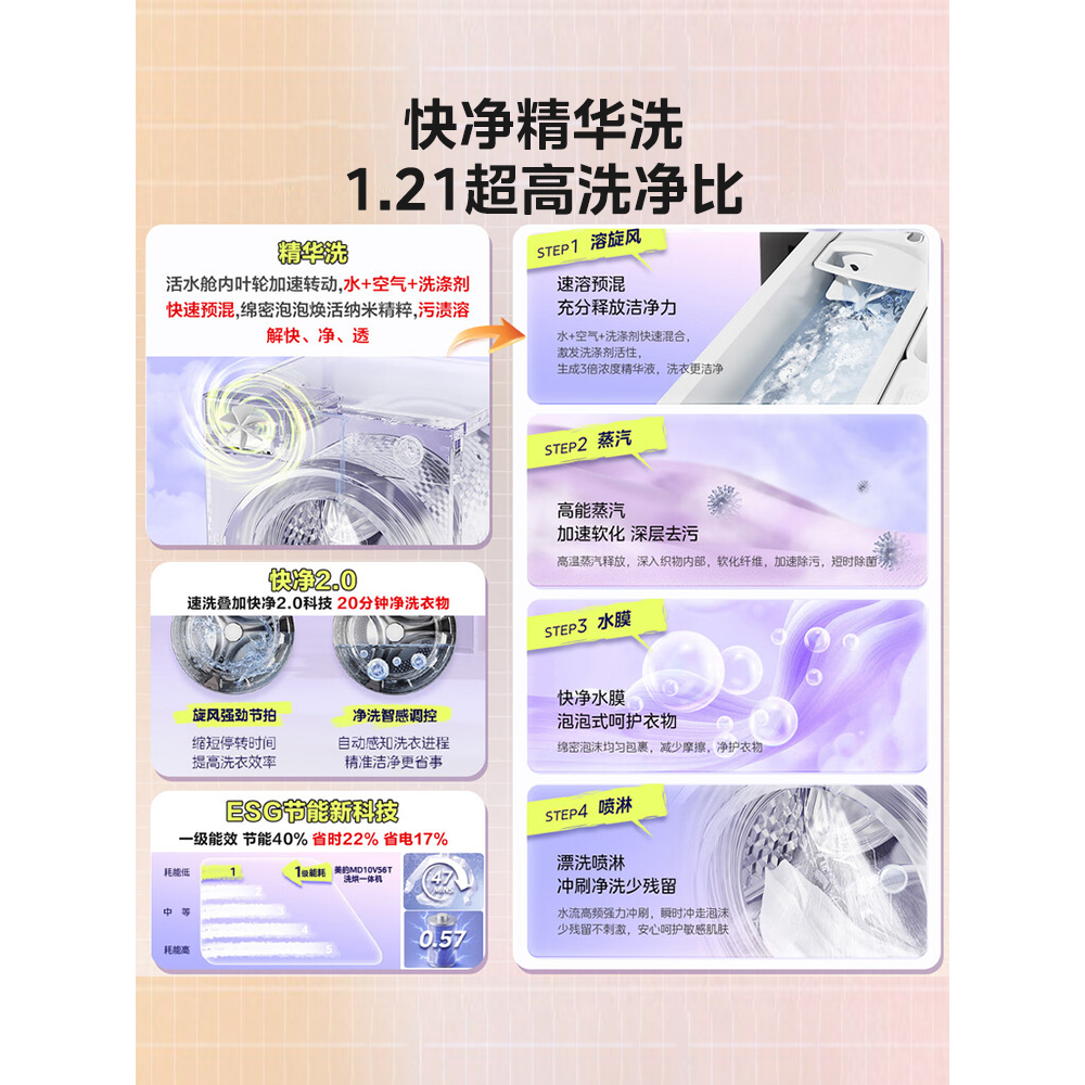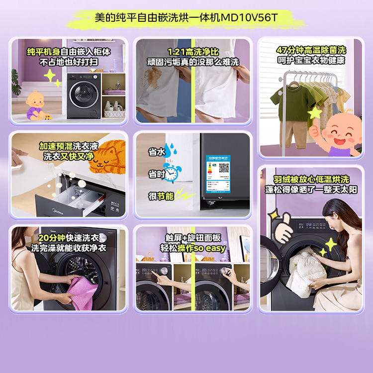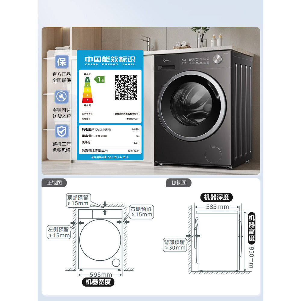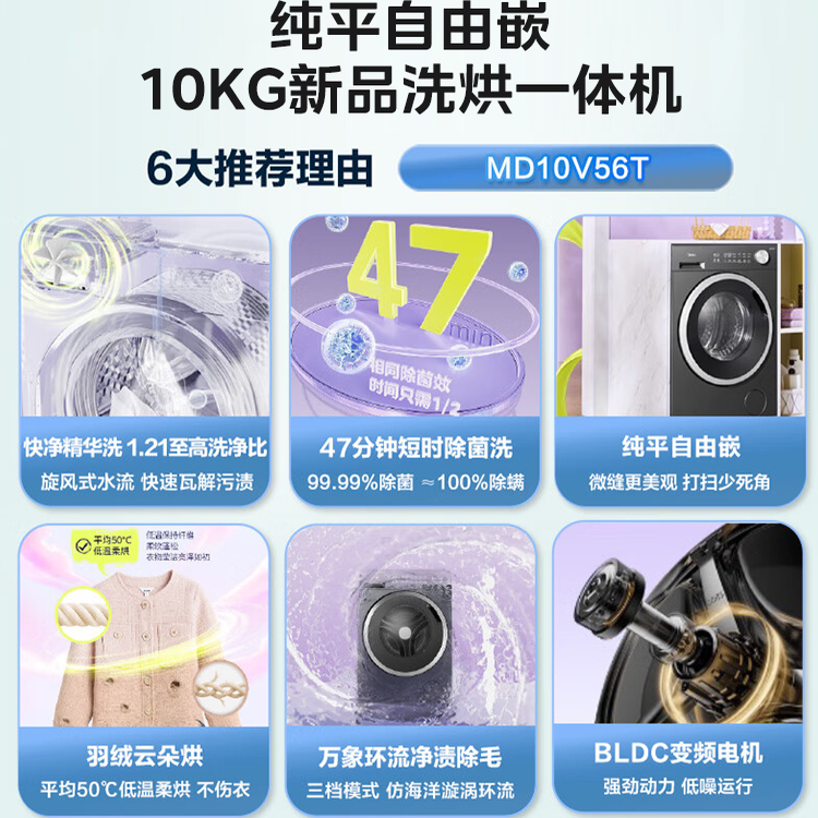 美的10kg滚筒洗衣机纯平嵌家用全自动除菌洗脱烘一体MG10V56T