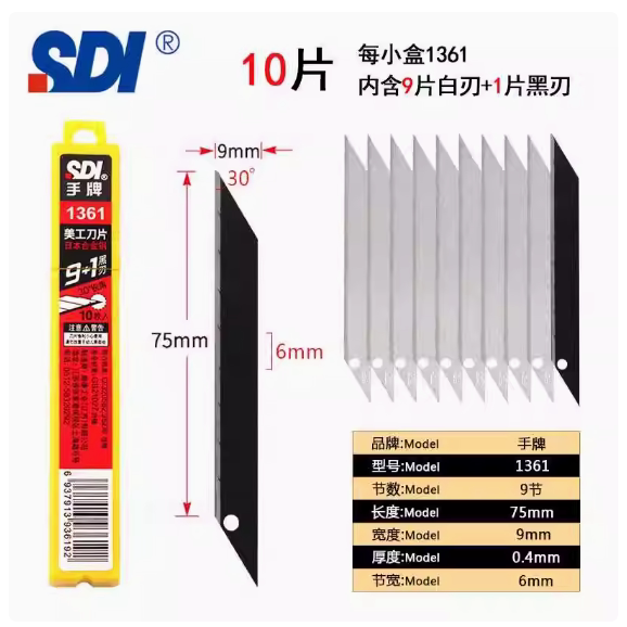 sdi手牌1361贴膜美工刀刀片9mm小号30度介刀片1403n车衣改色太阳膜灶台家具裁膜工具