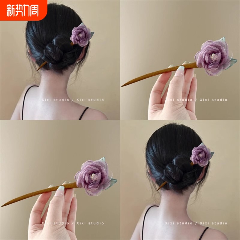 气质玫瑰花木簪夏季发簪网纱花朵发钗古风簪花头饰紫色发饰配饰女