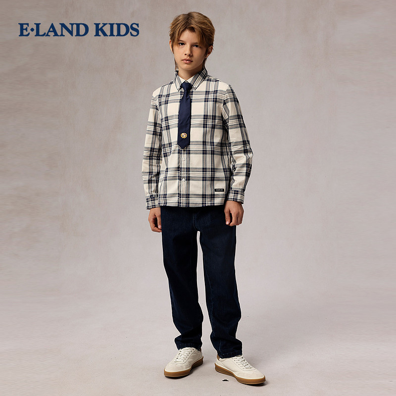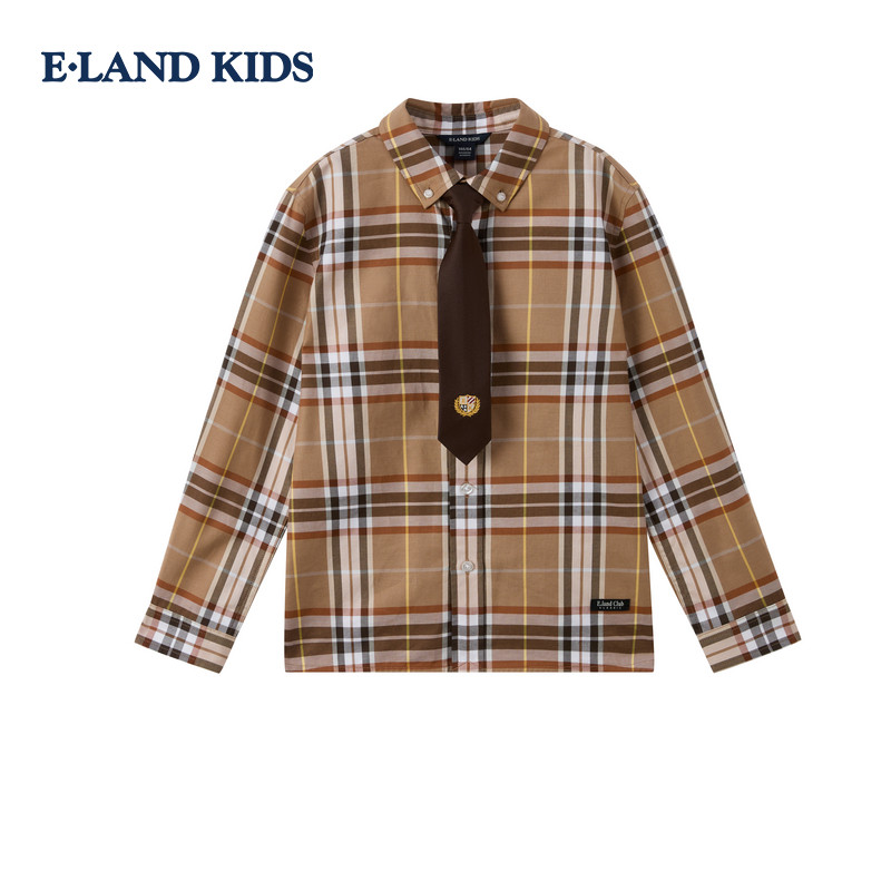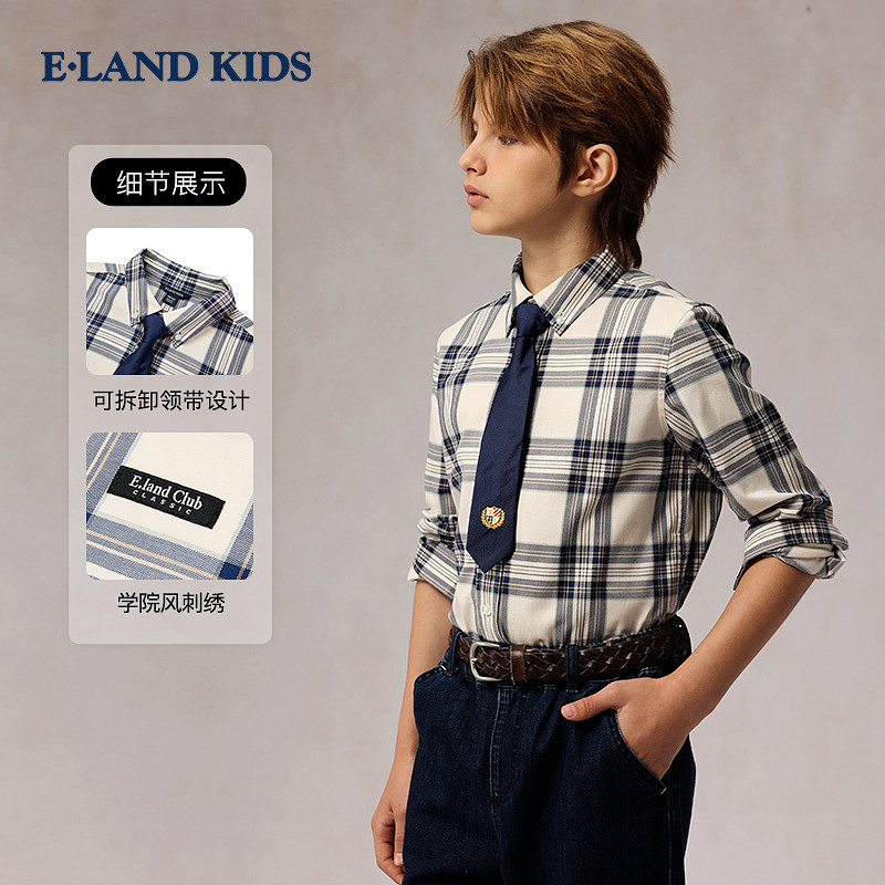 【100%棉】eland kids衣恋童装男童衬衫25年春季领带格纹长袖上衣