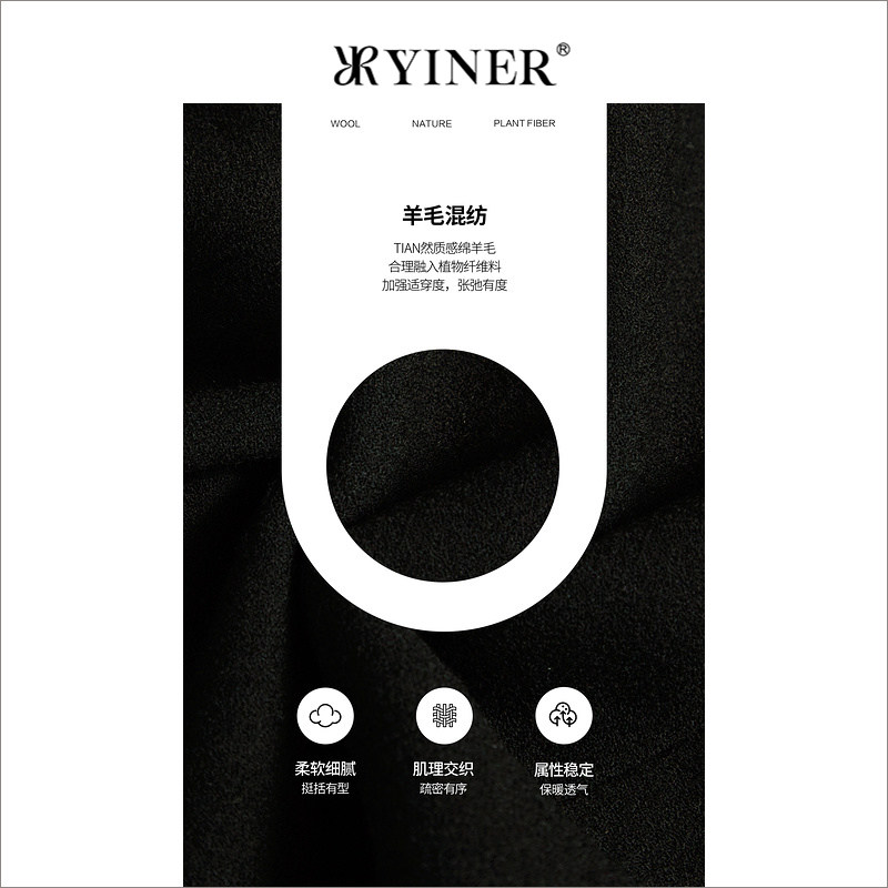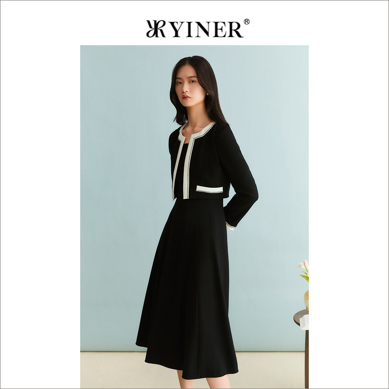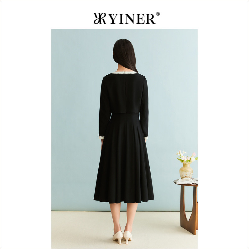 YINER音儿女装冬季撞色羊毛混纺收腰小黑裙连衣裙