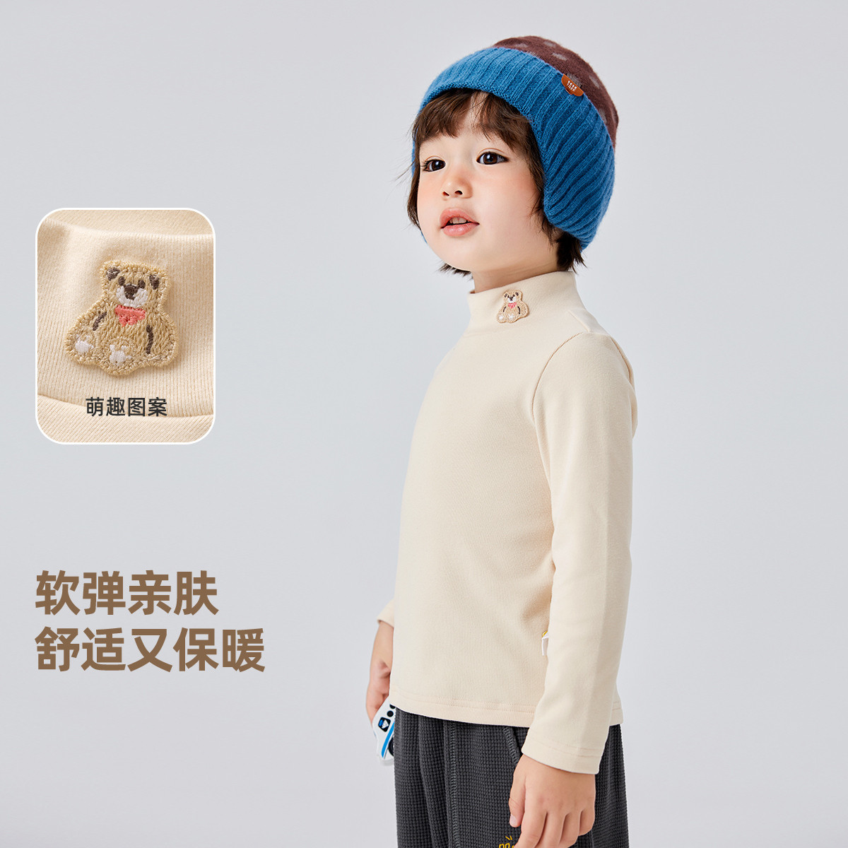 [发热]齐齐熊男童打底衫冬款宝宝条纹儿童半高领T恤童装女童纯色