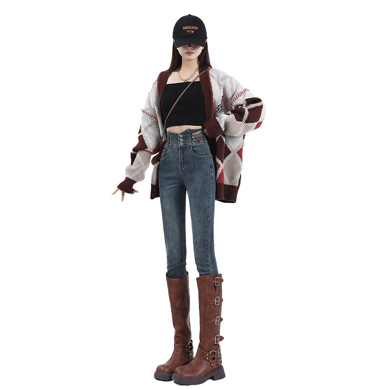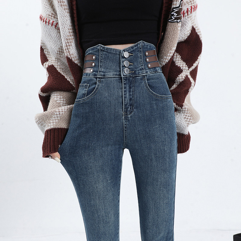 NG真维斯高腰牛仔裤女秋冬新款弹力排扣显瘦修身小脚加绒铅笔裤子