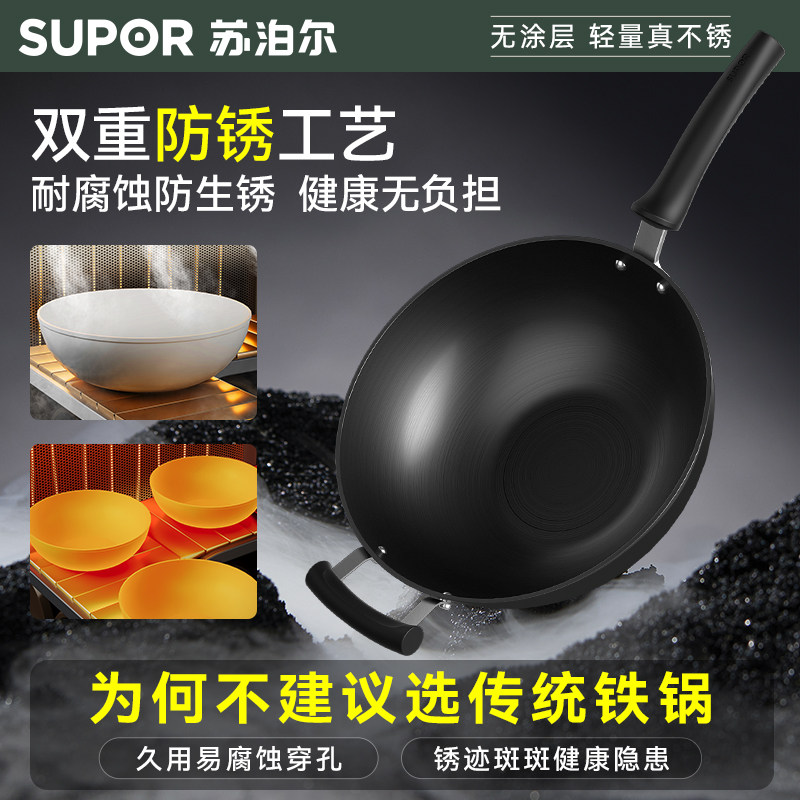 苏泊尔铁锅老式家用炒锅真不锈无涂层电磁炉炒菜锅官方正品旗舰