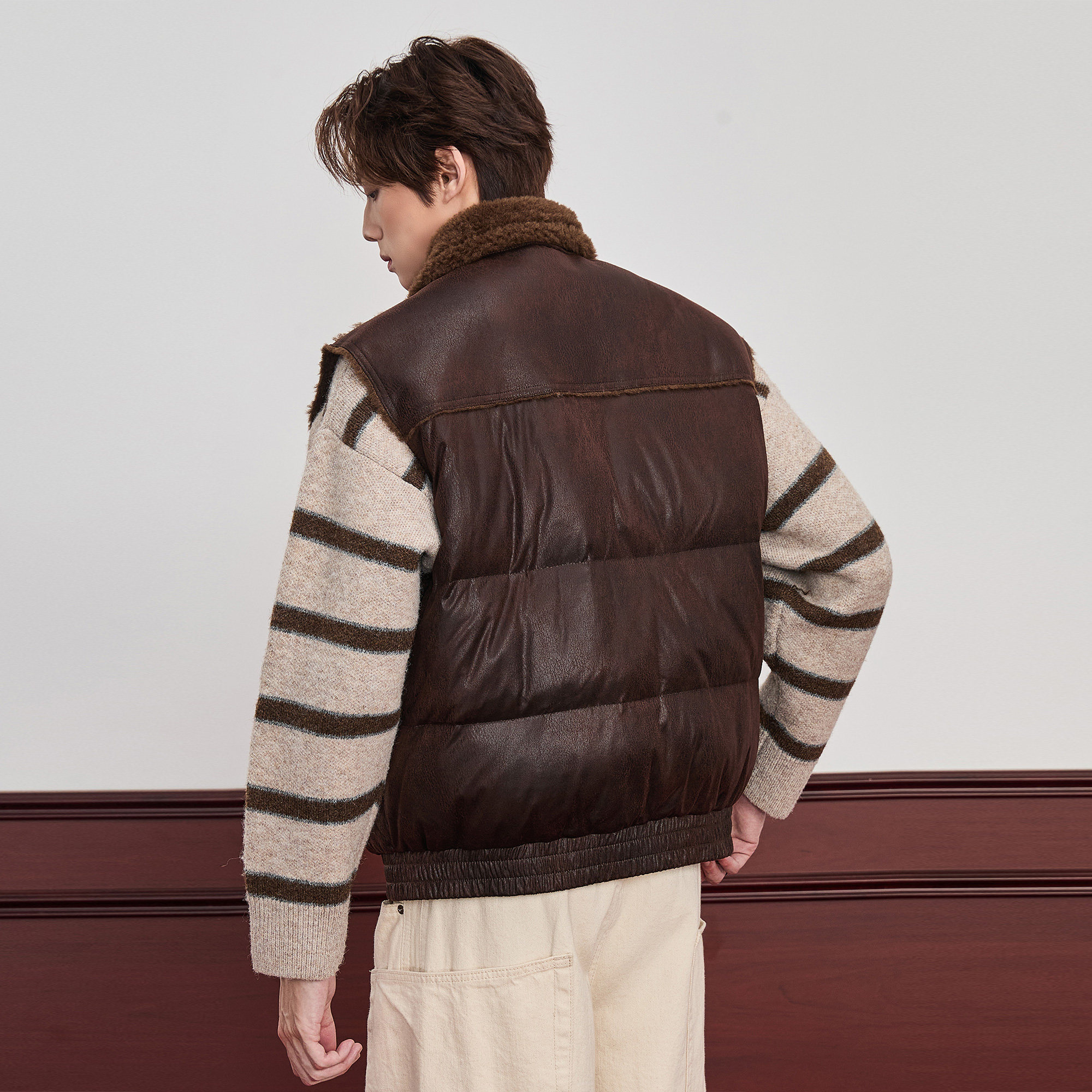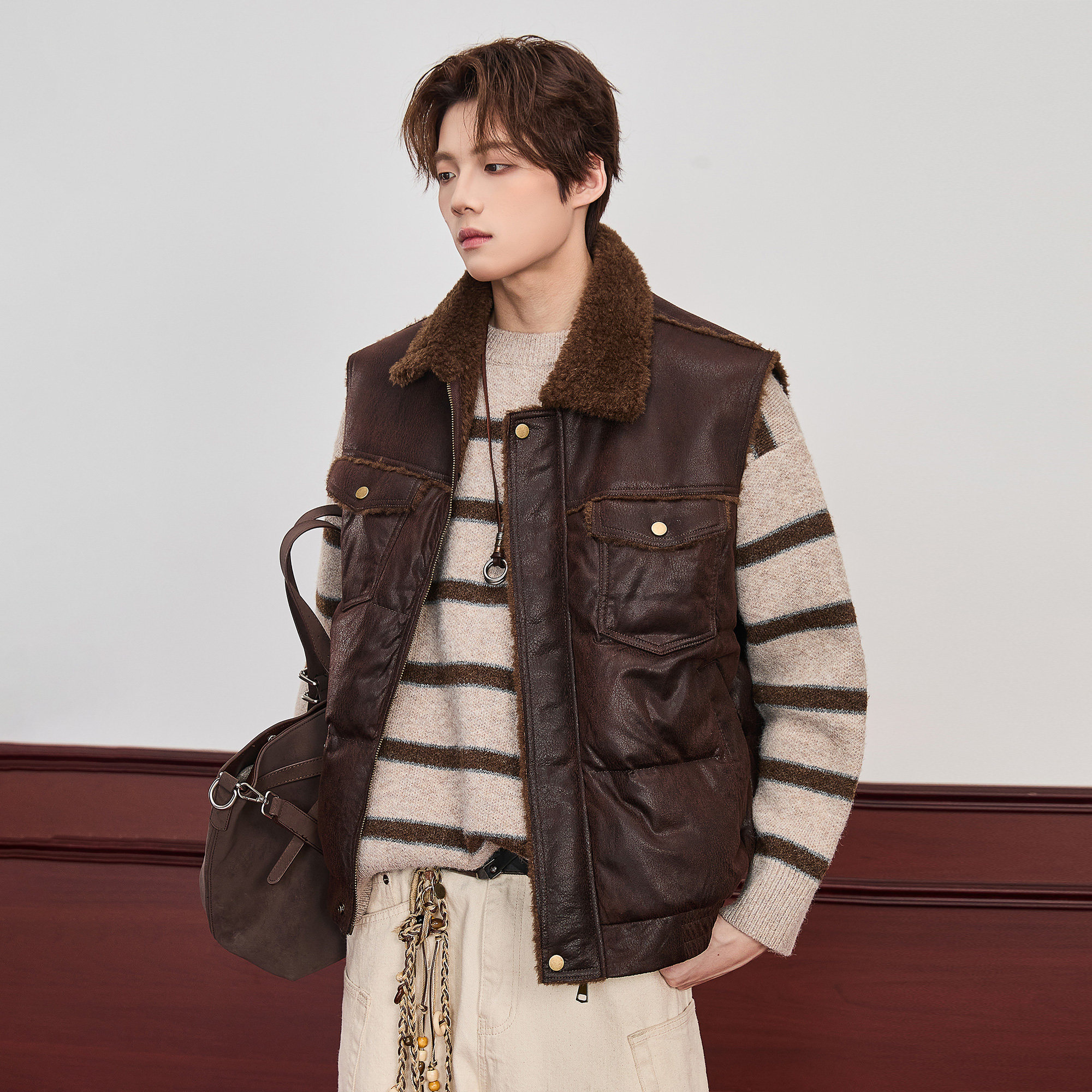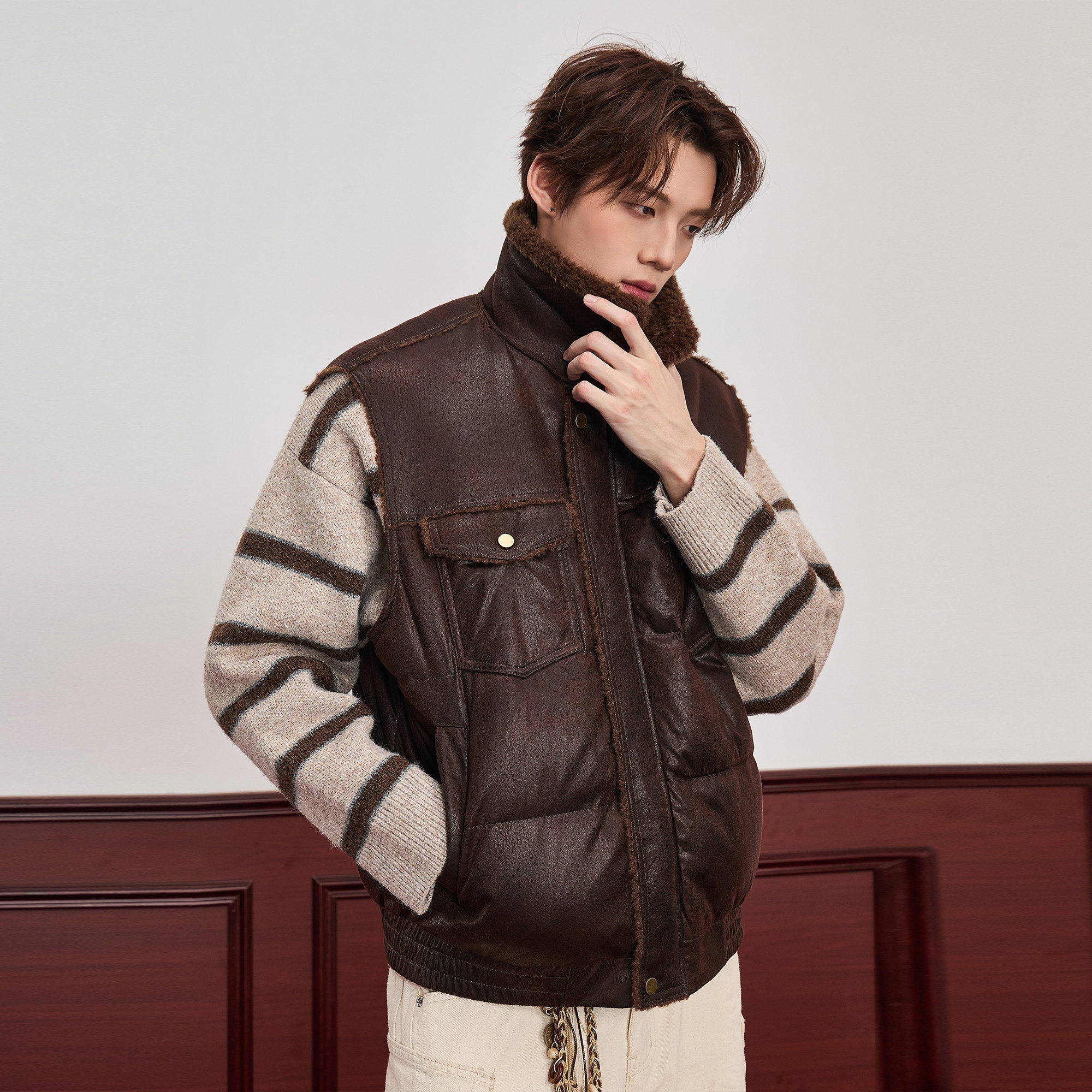 ALLIN 复古羊羔毛加厚皮衣马甲男秋冬情侣短款机车保暖皮夹克外套