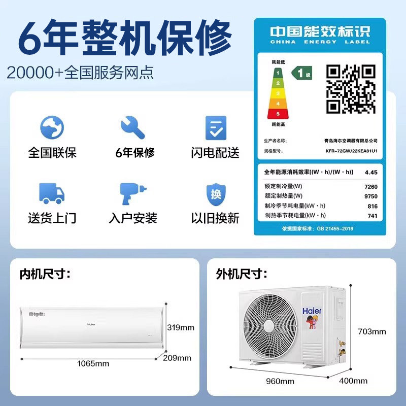 【国补8折】海尔空调1.5匹家用一级能效变频卧室挂机冷暖E1旗舰店