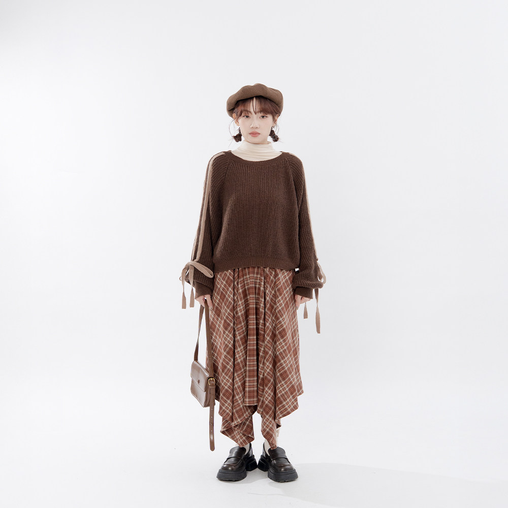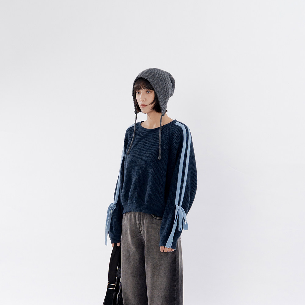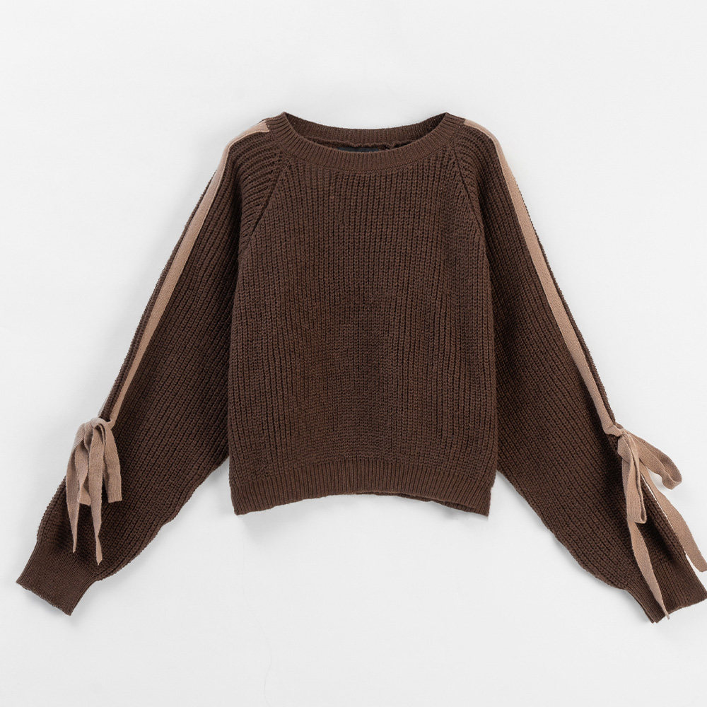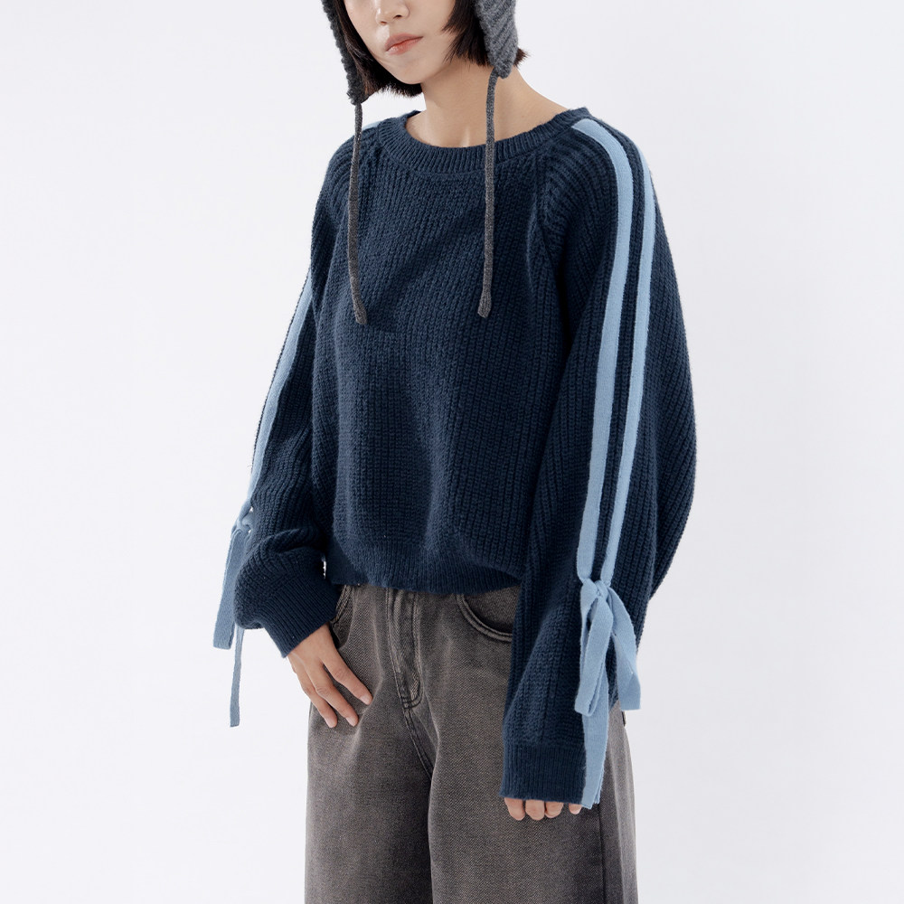 QUEENSHOP 2025秋冬新品女装配色蝴蝶结绑带针织长袖毛衣01013501