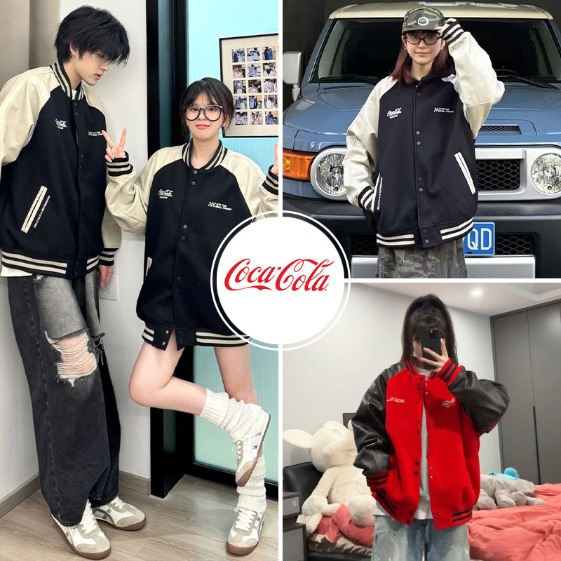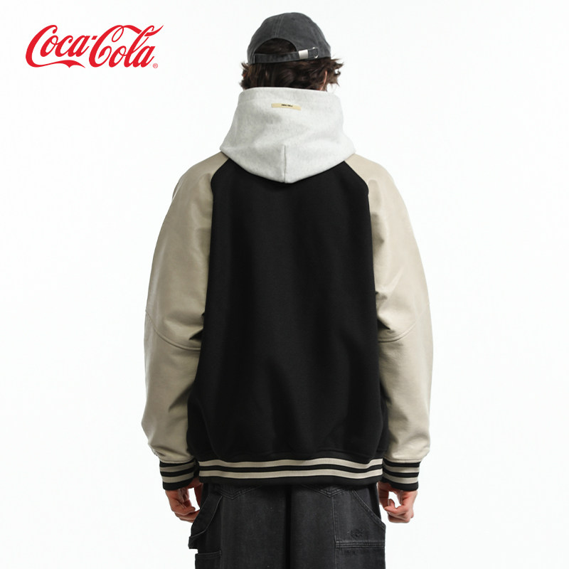 Coca-Cola/可口可乐毛呢PU皮拼接撞色夹克美式复古刺绣棒球服外套