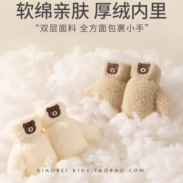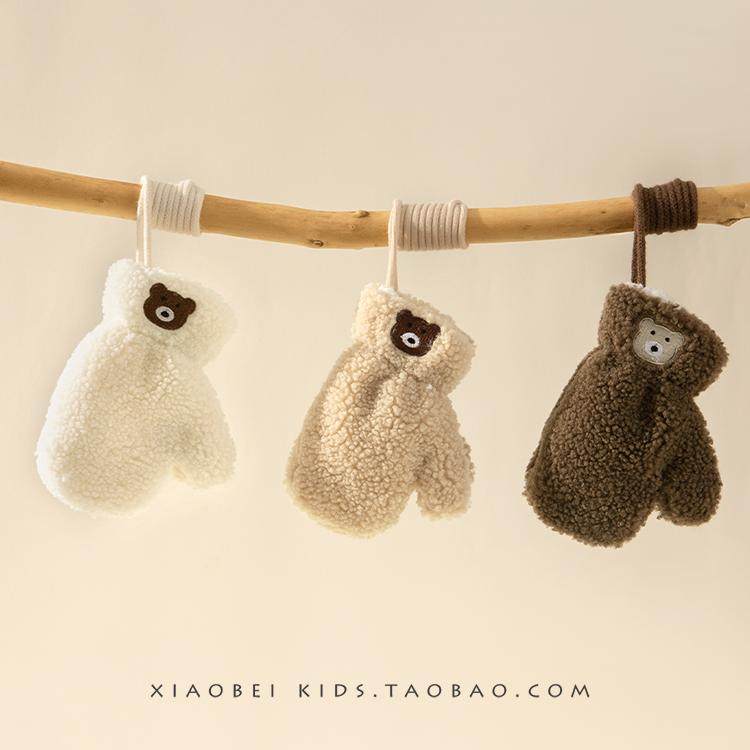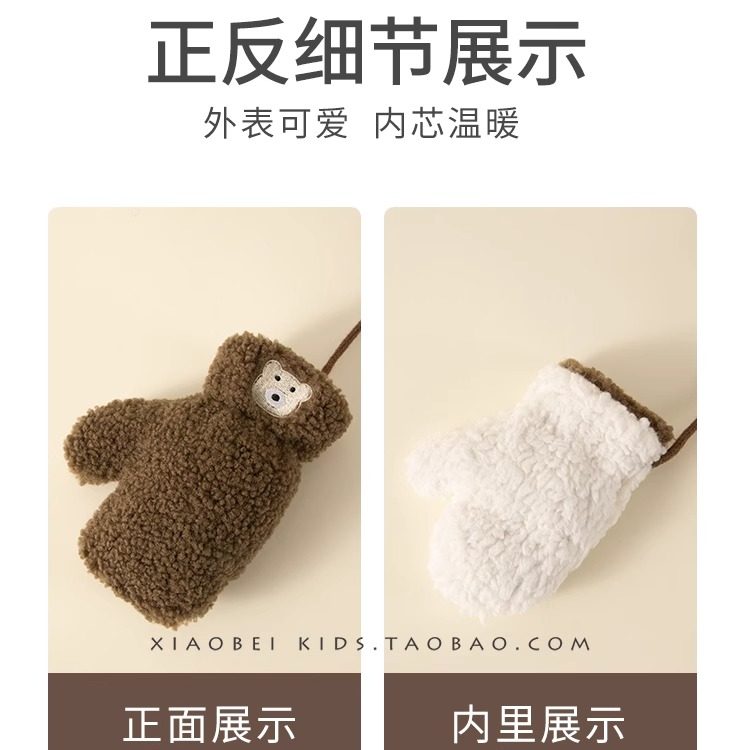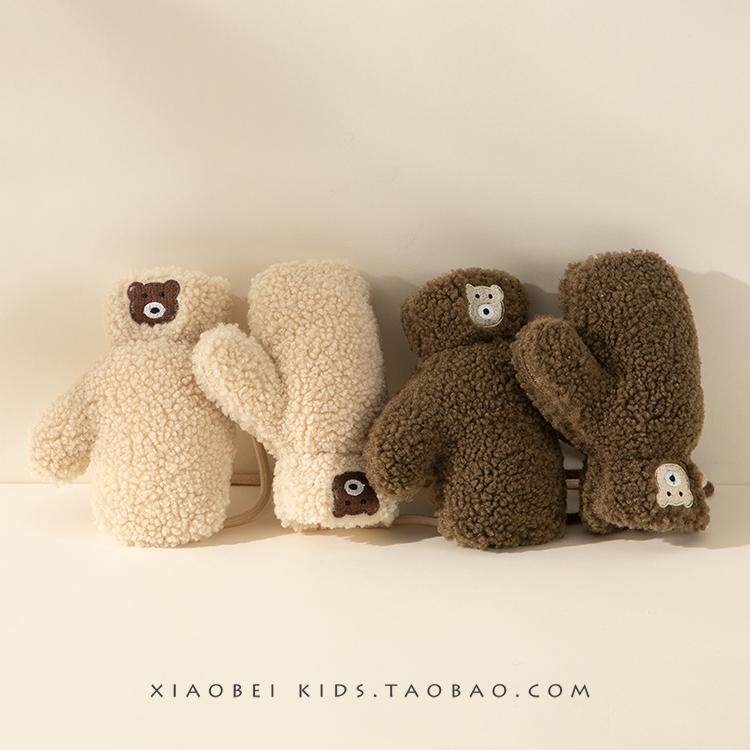 羊羔绒儿童手套秋冬季全包手指宝宝挂脖连指男童女童户外防风防寒