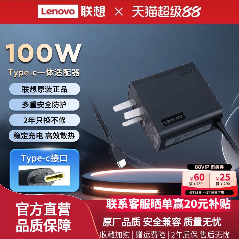 联想原装笔记本电脑typec充电器小新air yoga thinkpad 65W 100W电源适配器圆口方口电源线通用