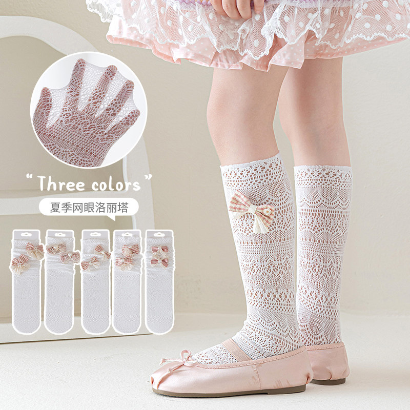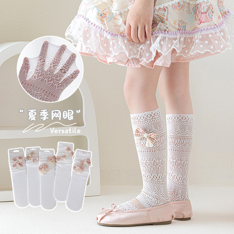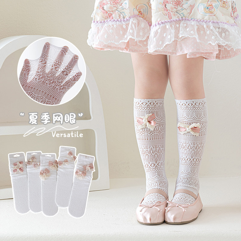 白色蕾丝袜子女宝夏季薄款蝴蝶结小腿袜甜美芭蕾风女童镂空高筒袜