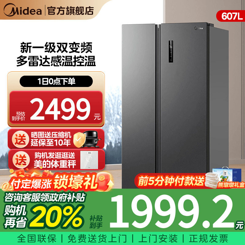 美的607L对开双开门大容量一级能效双变频风冷无霜家用电冰箱
