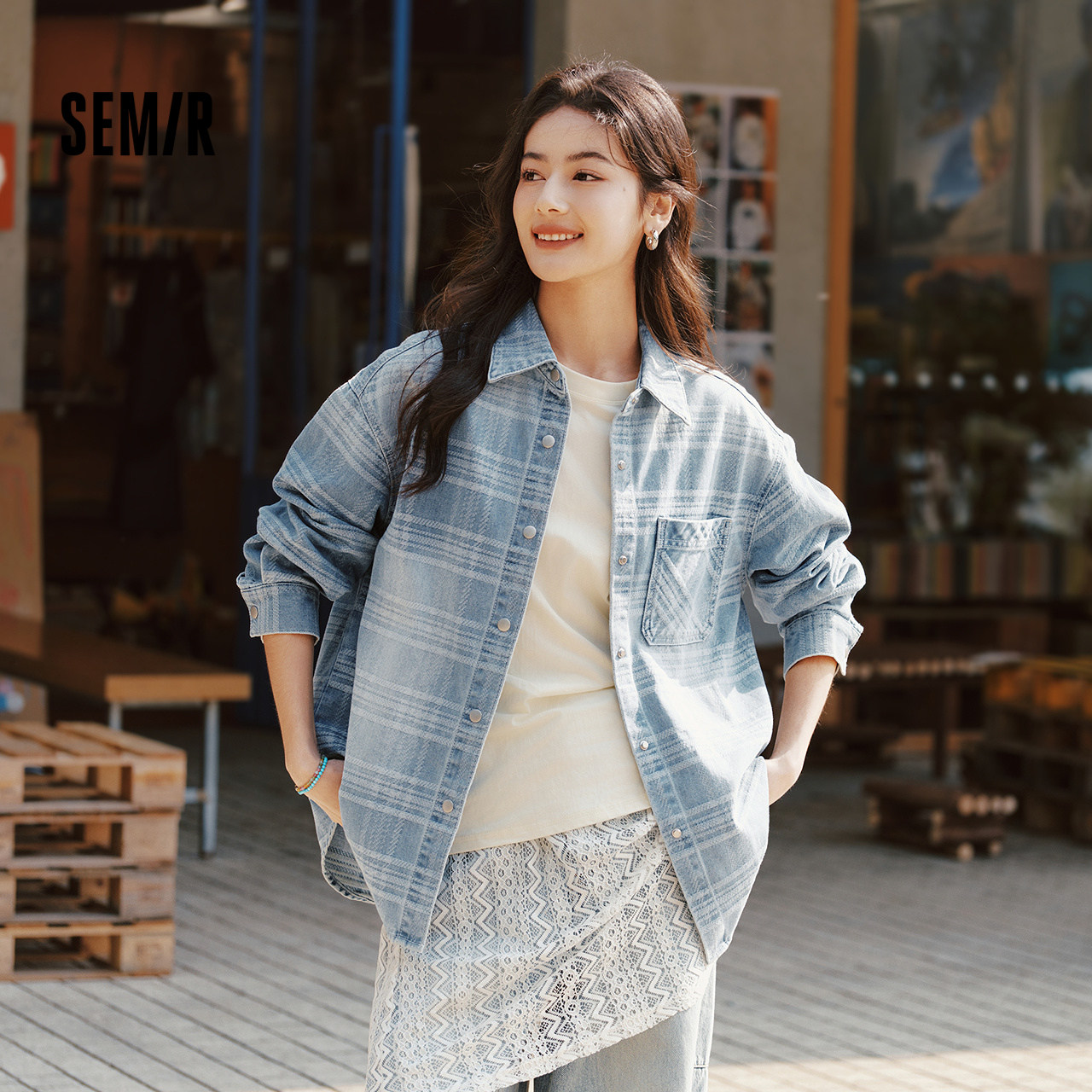 森柔|森马牛仔衬衫女春中长款oversize落肩长袖衣服格纹街头衬衣