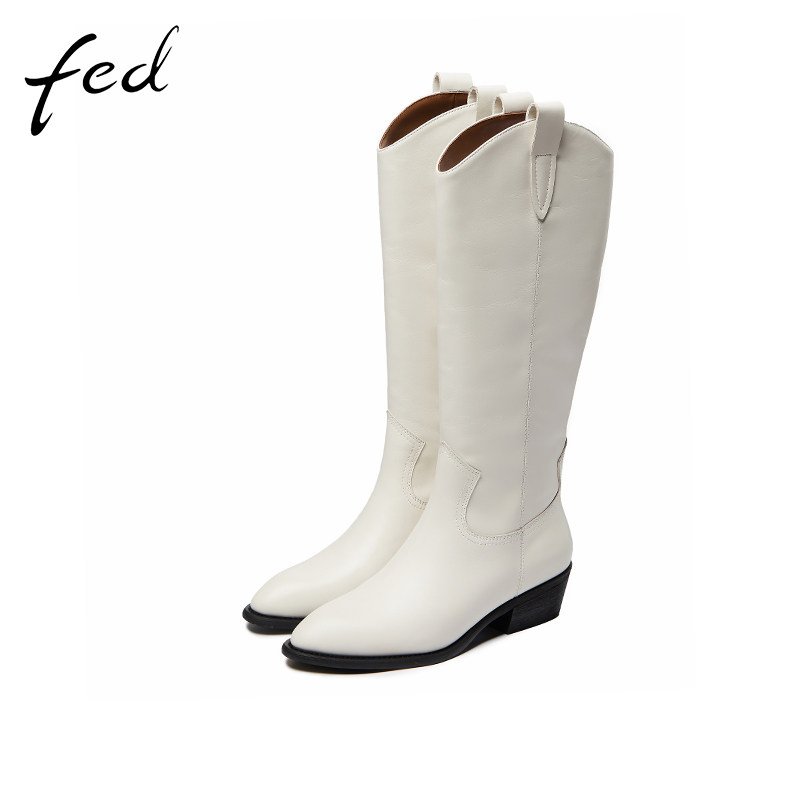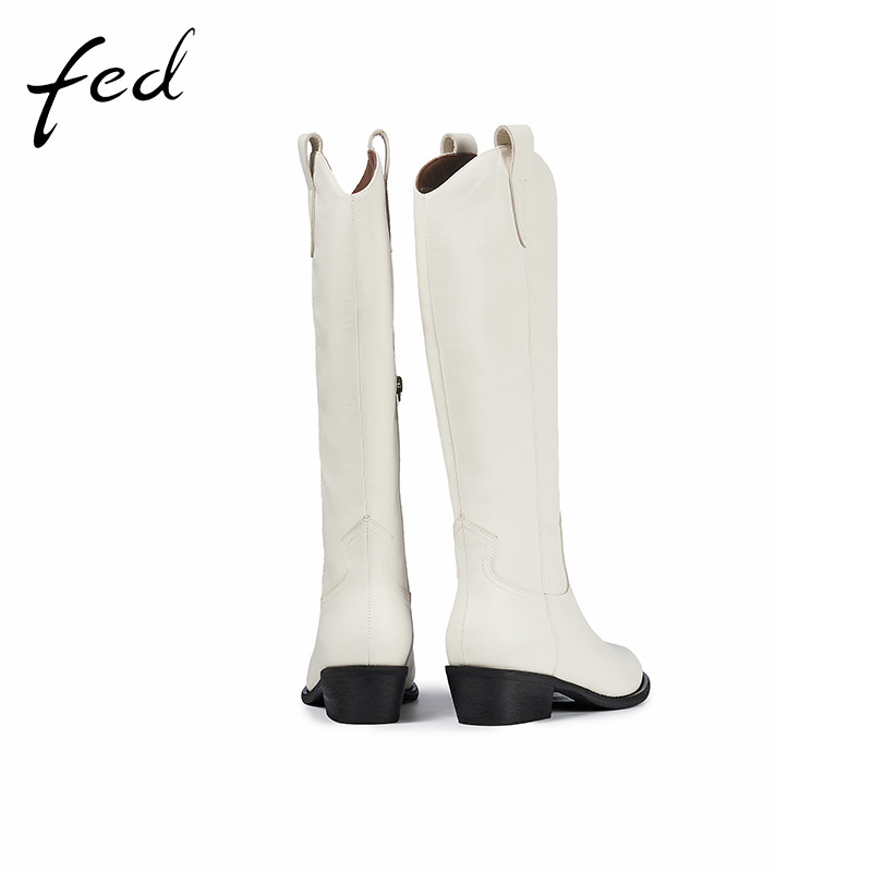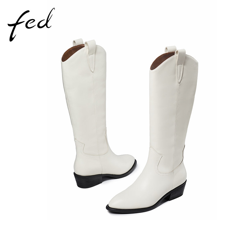 fed长筒靴女冬季新款牛皮加绒尖头粗跟时尚英伦风骑士靴女117-272