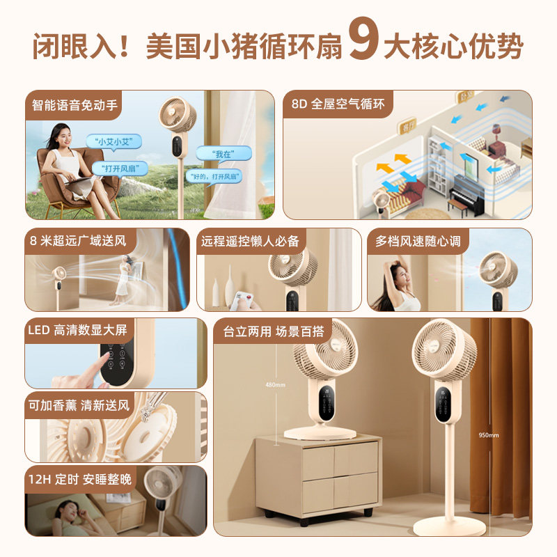 比赛小猪2026落地电风扇空气循环风扇家用新款静音智能语音台立式