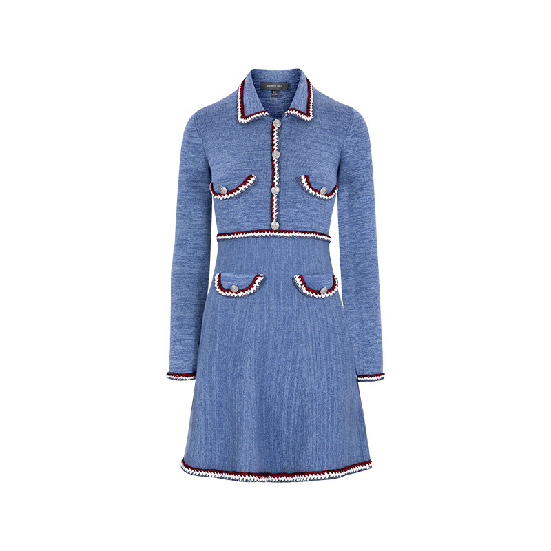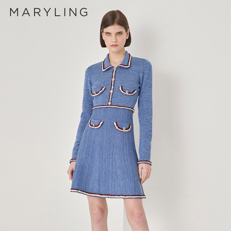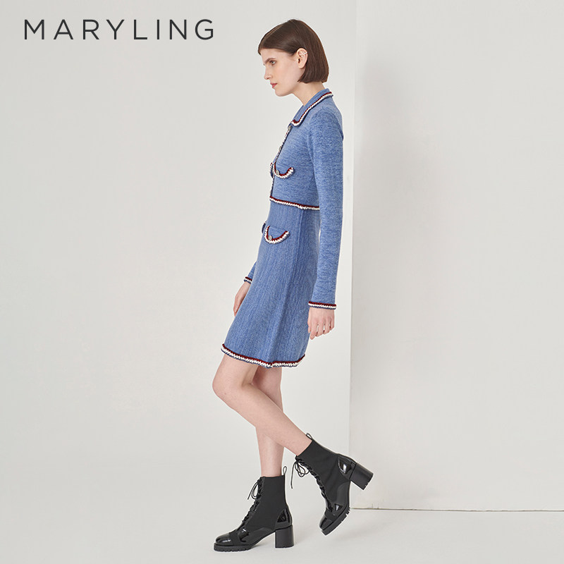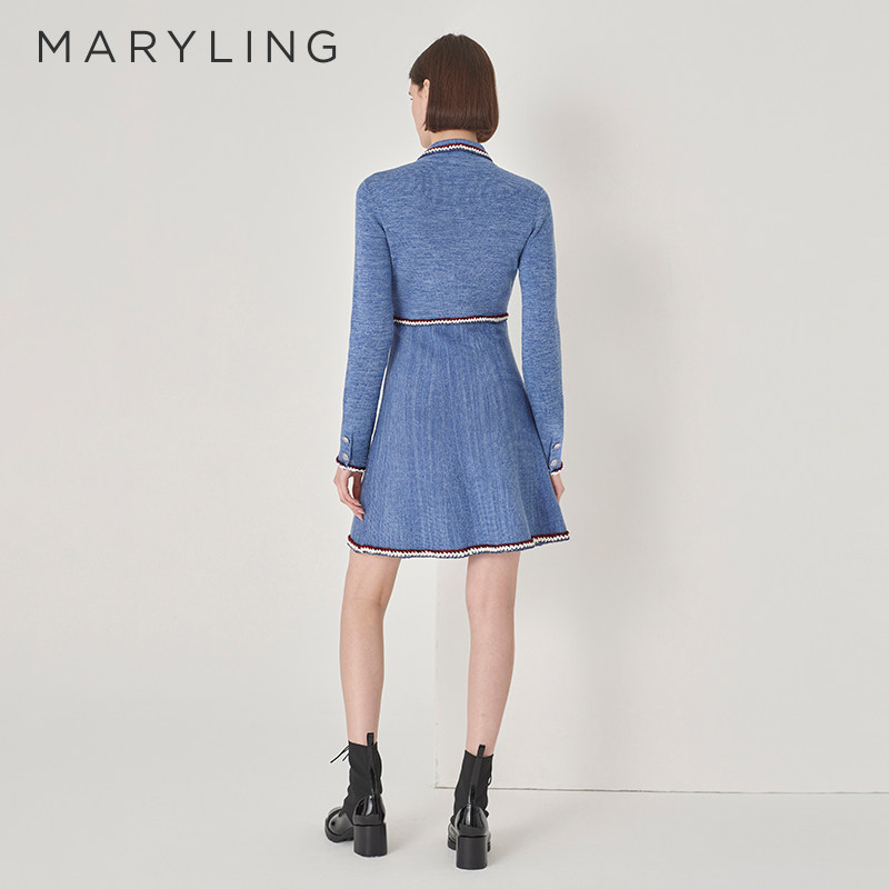 MARYLING玛俪琳秋季新品雾蓝色翻领长袖中裙羊毛针织连衣裙