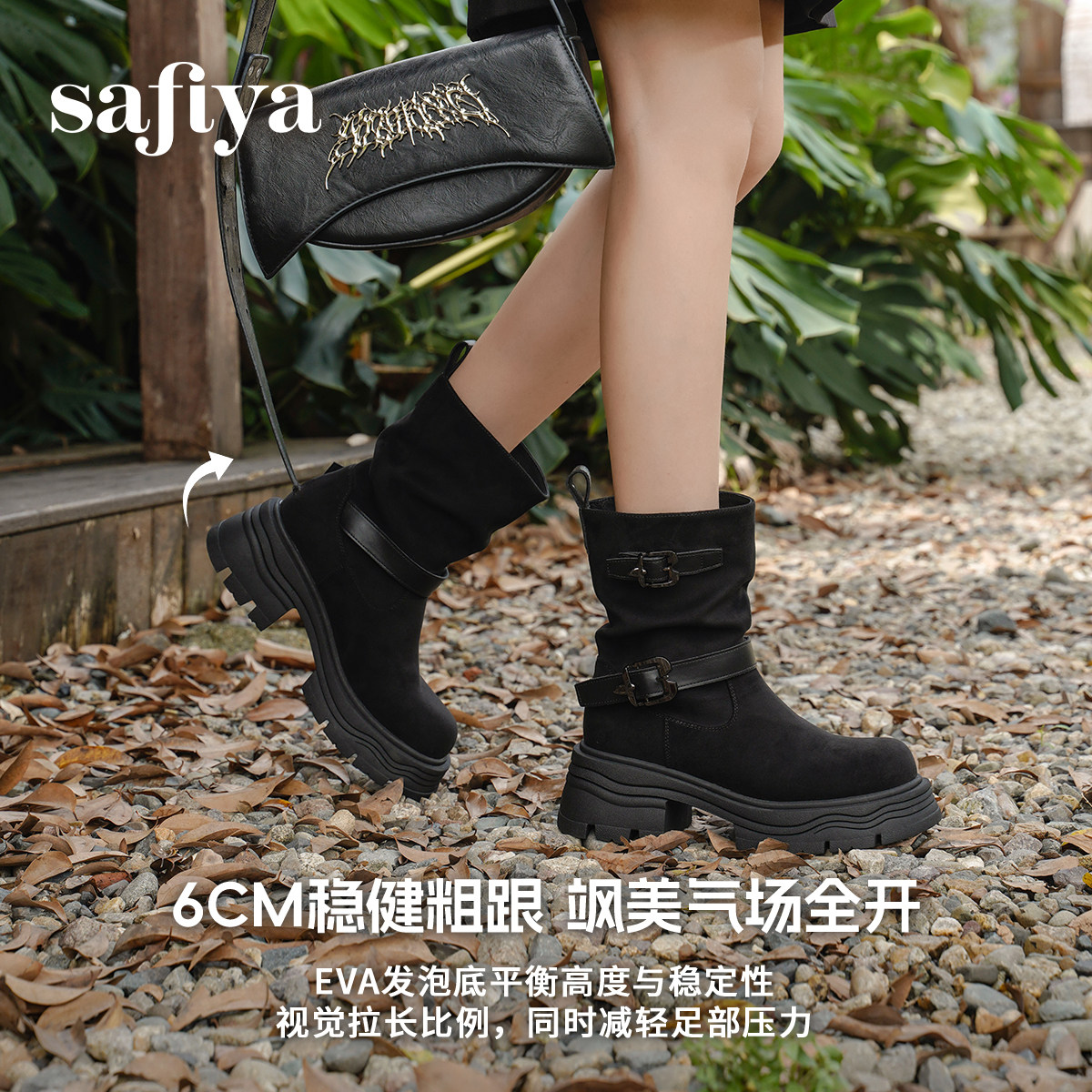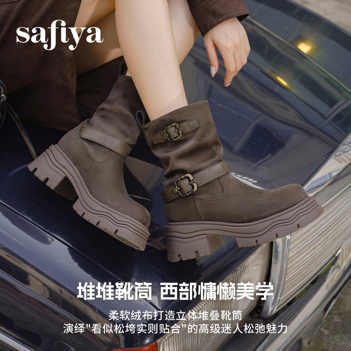 索菲娅【祝绪丹同款】冬季新品厚底皮带扣复古堆堆西部靴中长靴女