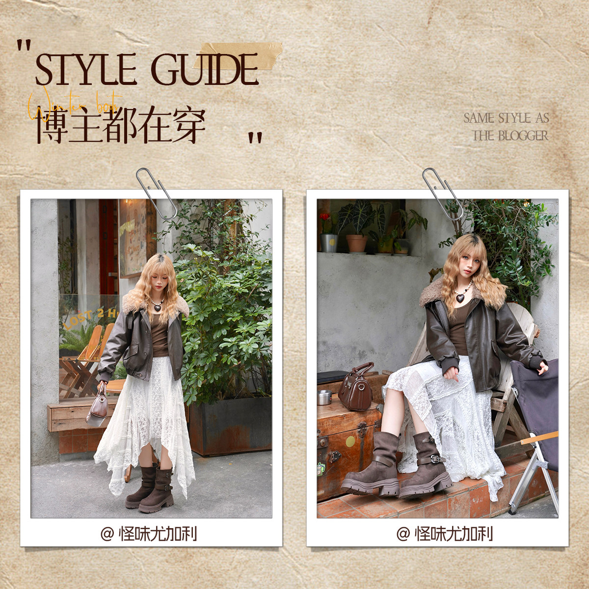 真美诗漫野前行2025冬新款牛皮双皮带饰扣美拉德风中筒靴西部靴女