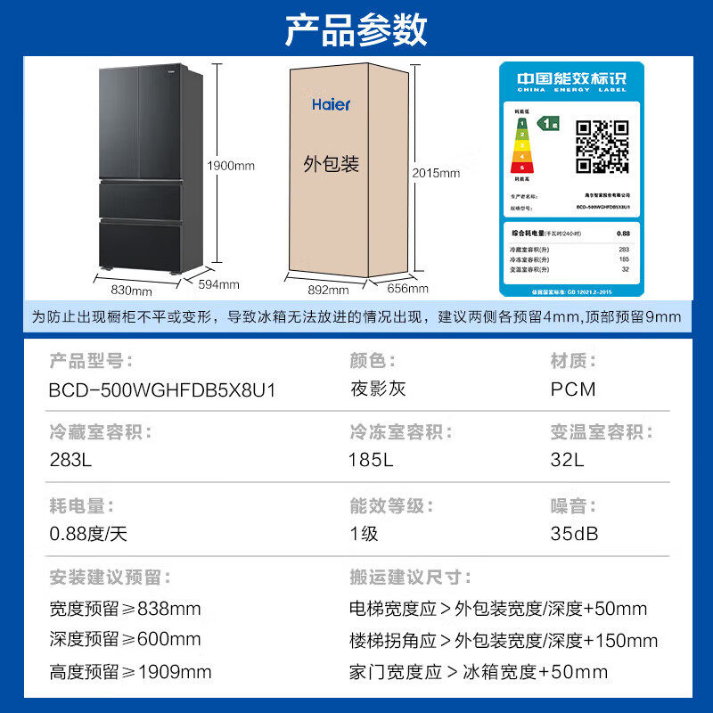 海尔法式冰箱500升超薄零嵌入式 家用大容量无霜全保鲜旗舰店正品