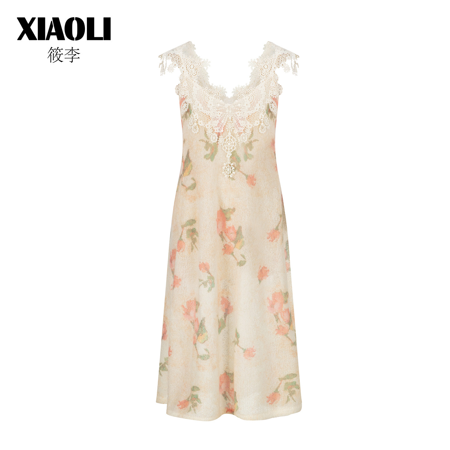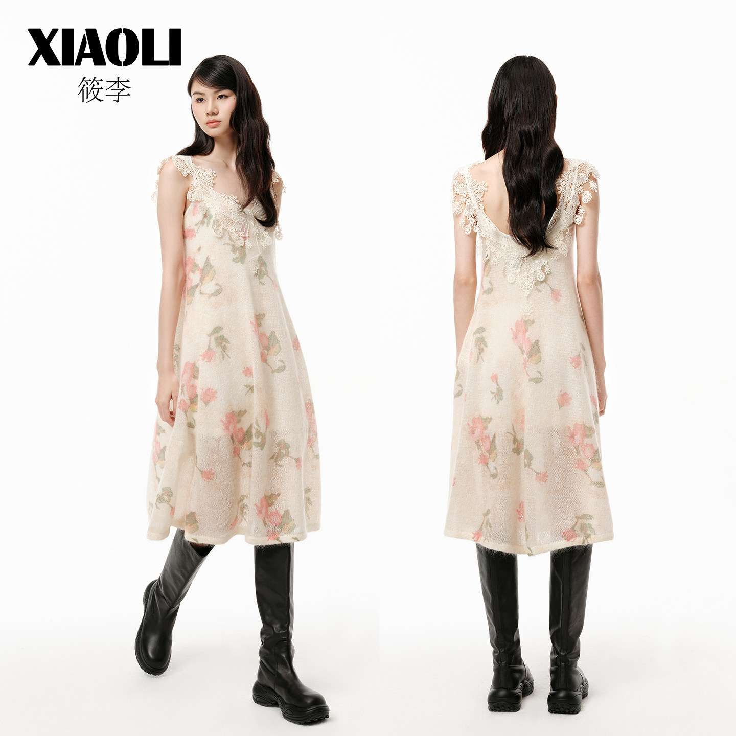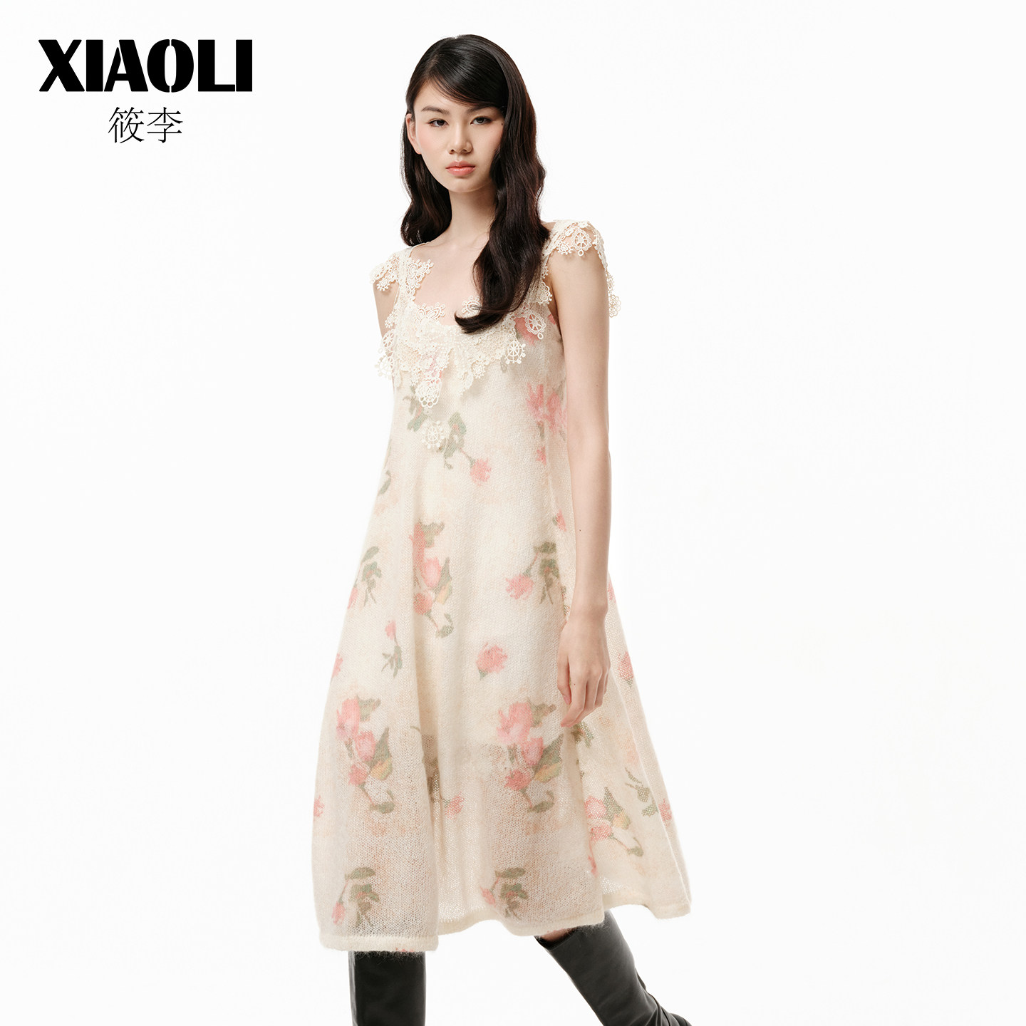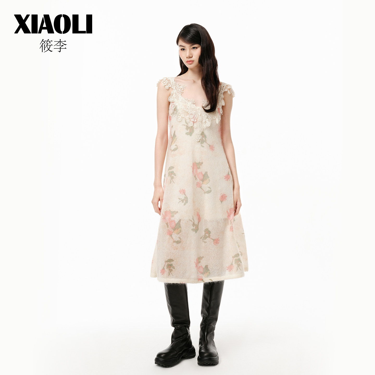 【XIAOLI筱李】印花马海毛V领蕾丝连衣裙25年冬季新品
