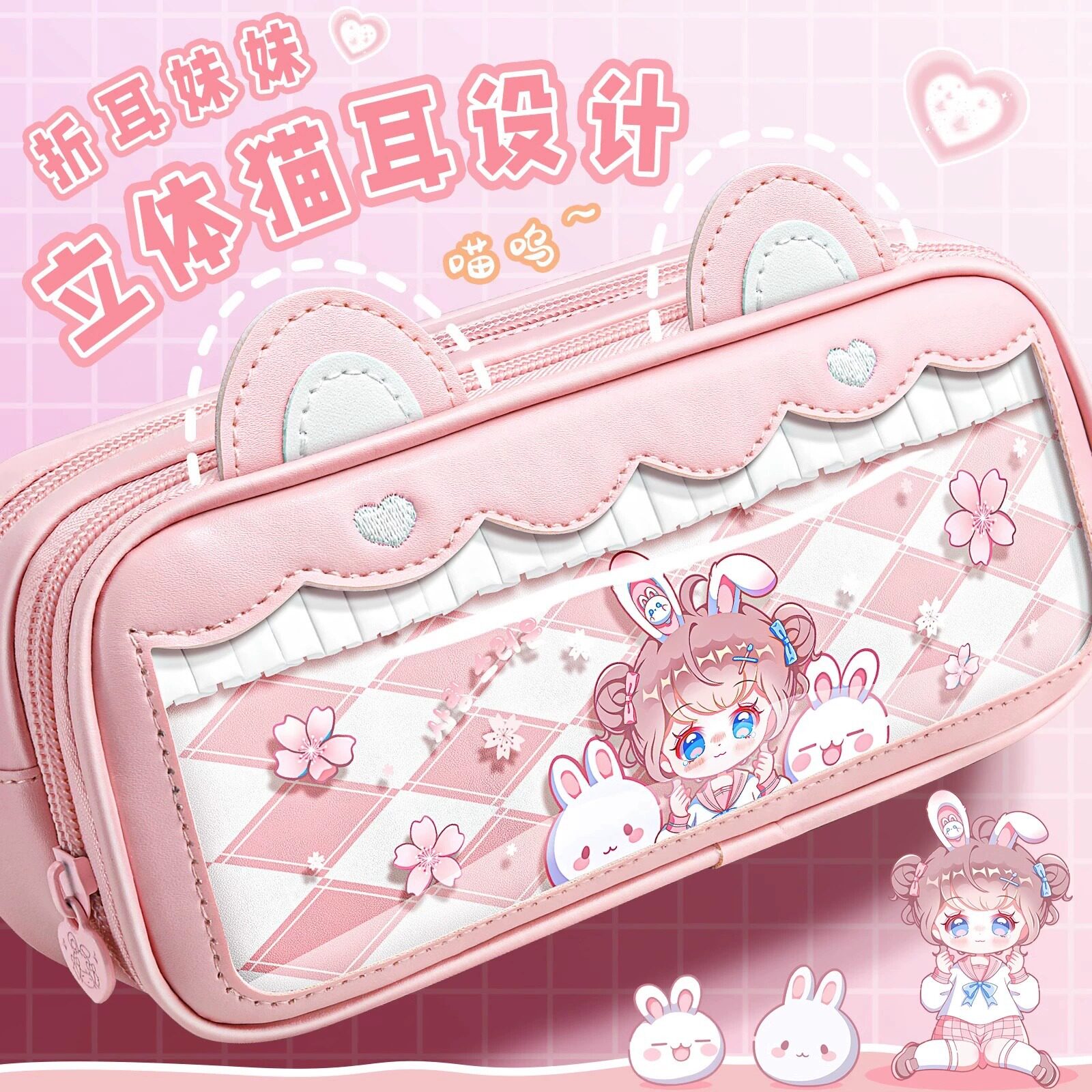 立体猫耳笔袋女机灵姐同款文具盒折耳妹妹新款大容量高颜值铅笔盒
