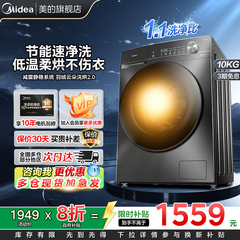 【以旧换新补贴】1.1洗净比美的10kg洗衣机滚筒家用除菌螨洗烘36
